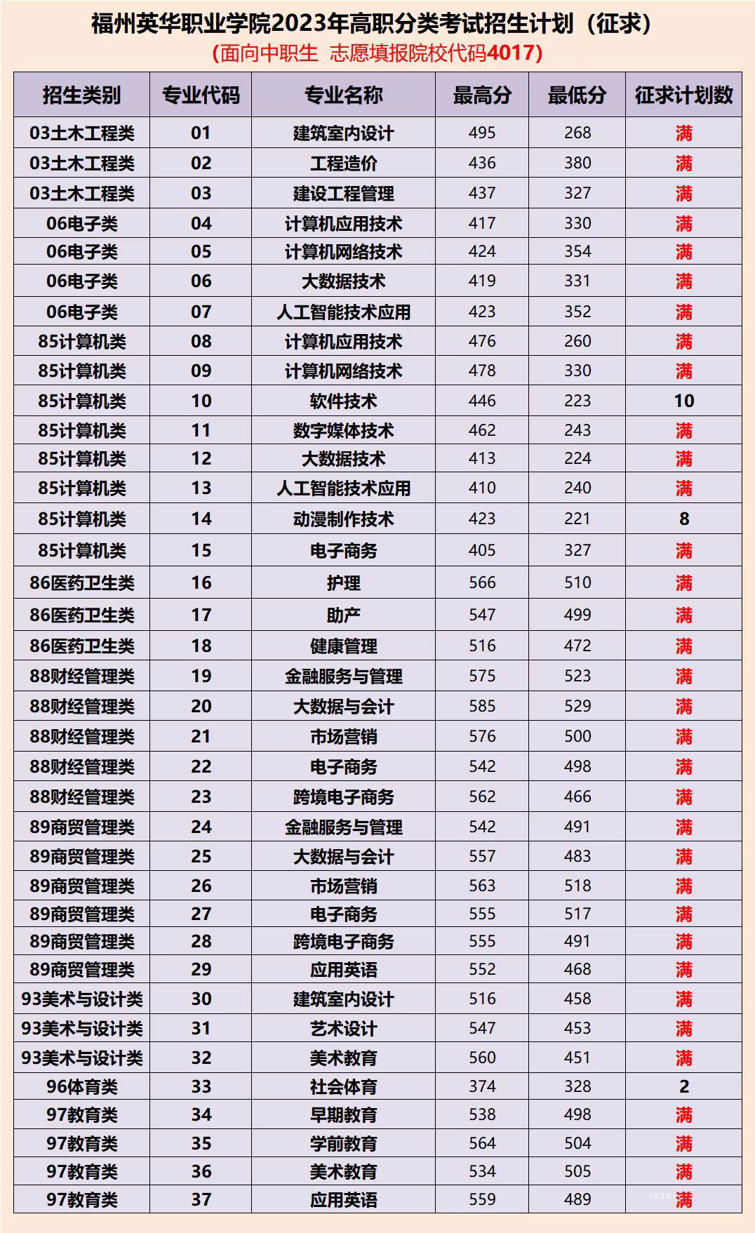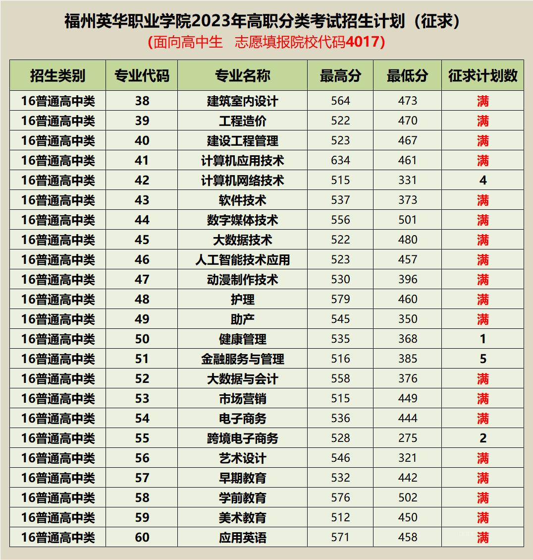 福州英华职业学院2023年高职分类考试征求志愿公布