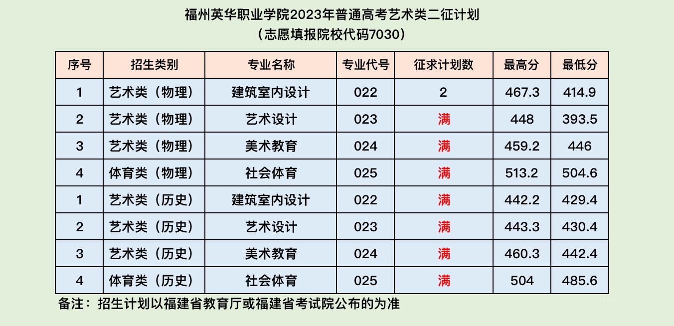 福州英华职业学院2023年福建省普通高考艺术类第二次征求志愿计划公布