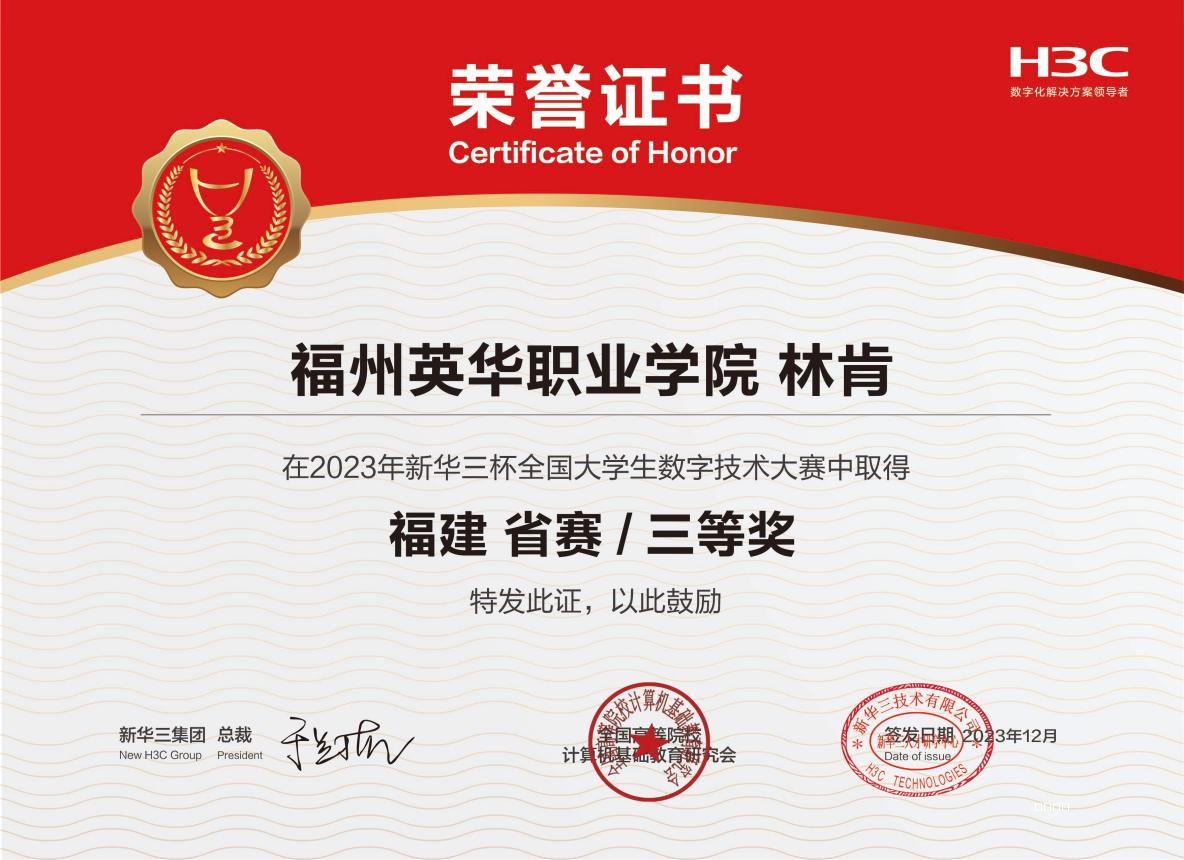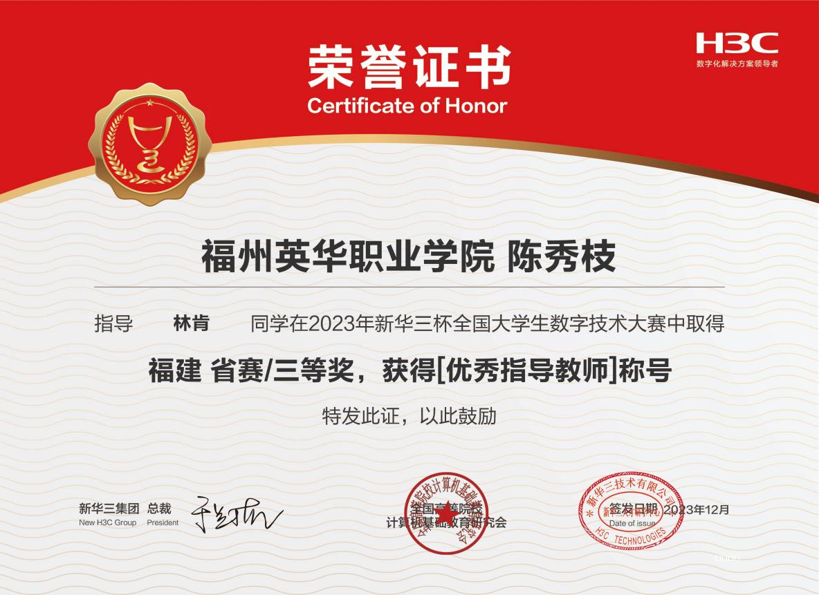 11月26日,第13届“新华三杯”2023全国大学生数字技术大赛福建赛区复赛在福州举行,我系2022级计算机应用技术专业的林肯同学荣获高职组三等奖,我系陈秀枝老师获得优秀指导教师称号。