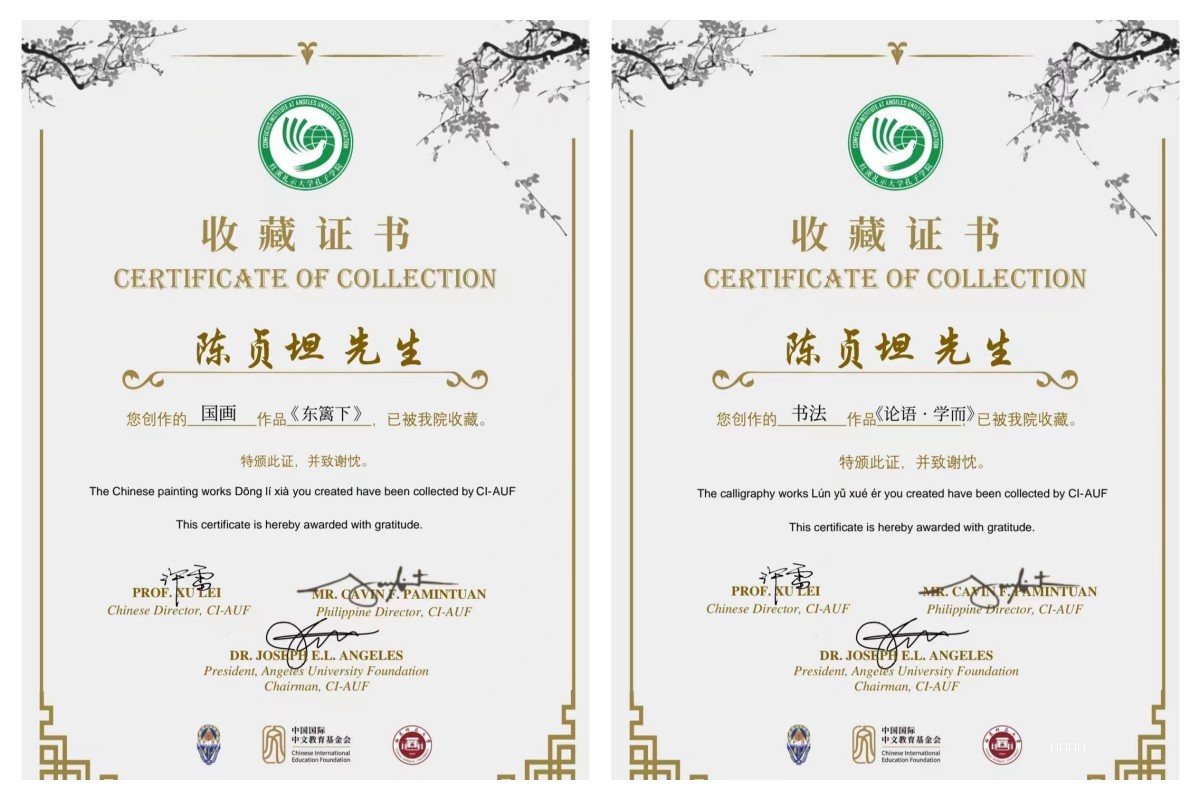 教育与外语系美术教师陈贞坦创作的中国画《东篱下》和书法《论语·学而》两幅作品,被菲律宾红溪礼示孔子学院收藏。