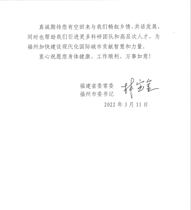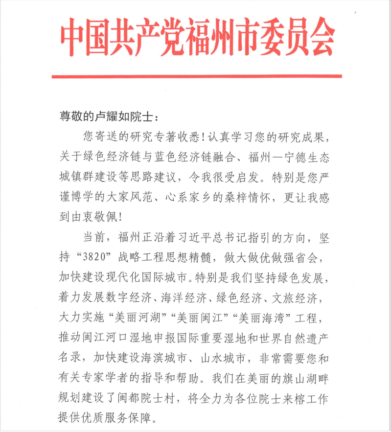 福建省委常委、福州市委书记林宝金给卢耀如院士的亲笔回信
