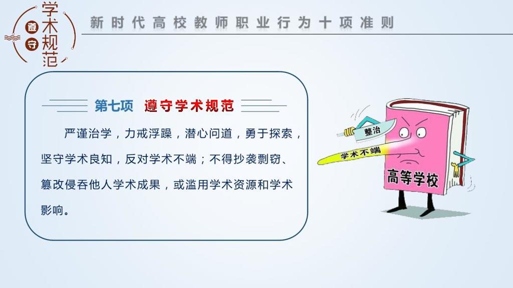 教师是太阳底下最光辉的职业,被誉为人类灵魂的工程师。我们接受大学教学和科研职位,就意味着承诺遵守学术规范。这是学者与师者应当坚守的职业底线,是树人和立校之本,也是教学和科研工作的基础要素。作为一项基本职责,我们还要帮助学生在学术生涯起步之初,筑牢恪守学术规范、追求科学真理的思想根基,积极引导学生树立崇高的学术目标,知晓学术界通行的职业道德基本准则,警惕并避免发生学术不端行为,认识到违反学术诚信将会受到惩戒。