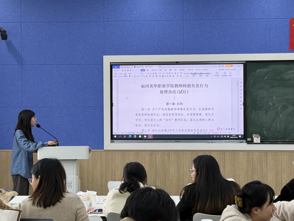 我院各部门组织教职工学习了《高等学校教师职业道德规范》《新时代高校教师职业行为十项准则》《教育部关于高校教师师德失范行为处理的指导意见》《福州英华职业学院教师师德失范行为处理办法(试行)》等文件,以违反高校教师职业行为十项准则典型案例为反面教材,进行师德警示教育。