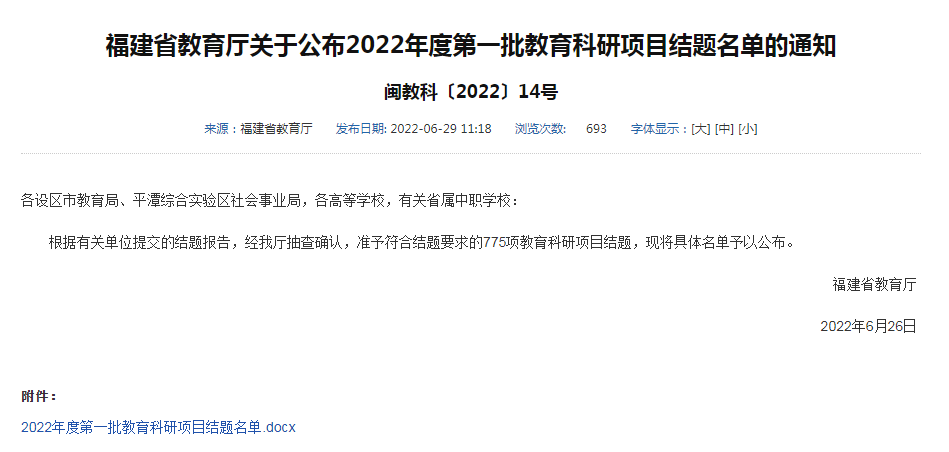 近日,福建省教育厅下发了《福建省教育厅关于公布2022年度第一批教育科研项目结题名单的通知》(闽教科〔2022〕14号)。经专家评审、省教育厅审核,我院三项教育科研项目通过结题验收,现予以公布。