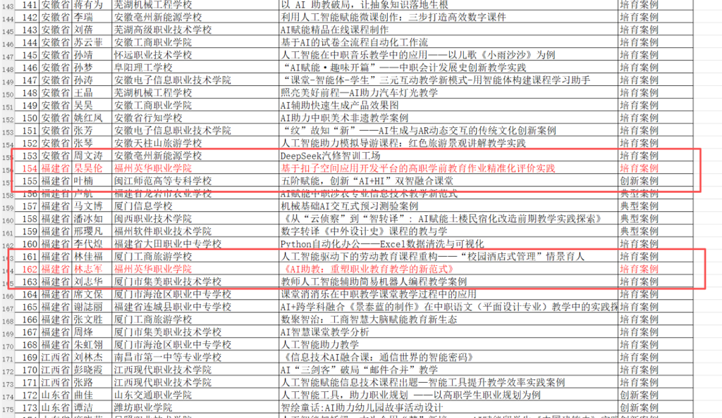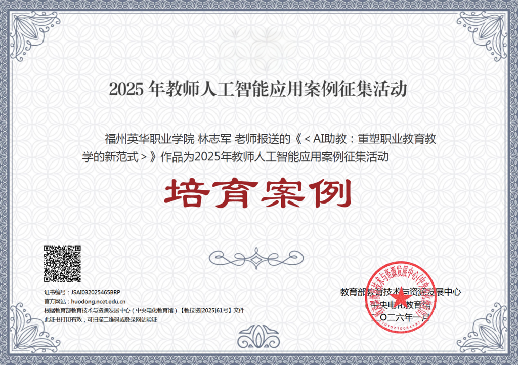 近日,教育部教育技术与资源发展中心(中央电化教育馆)公布2025年教师人工智能应用案例征集活动结果,我院推荐的《AI助教:重塑职业教育教学的新范式》(作者:林志军)与《基于扣子空间应用开发平台的高职学前教育作业精准化评价实践》(作者:杲昊伦)两项案例成功入选。