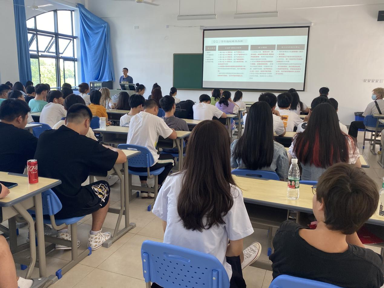 各专业新生辅导员根据学校《学生手册》及学校疫情防控管理相关规定,通过案例分析分别就学生学籍管理、学生住宿管理、学生违纪处理、学生奖励管理、疫情防控期间学生处分条例等进行详细解读。向新生特别是针对学生日常生活中有可能会出现的违纪情况进行了重点解读和提醒。希望各位新生在今后的大学生活中能以校纪校规为准则,遵守规章制度,规范自己的言行,成为一名遵纪守法、德才兼备的优秀大学生。