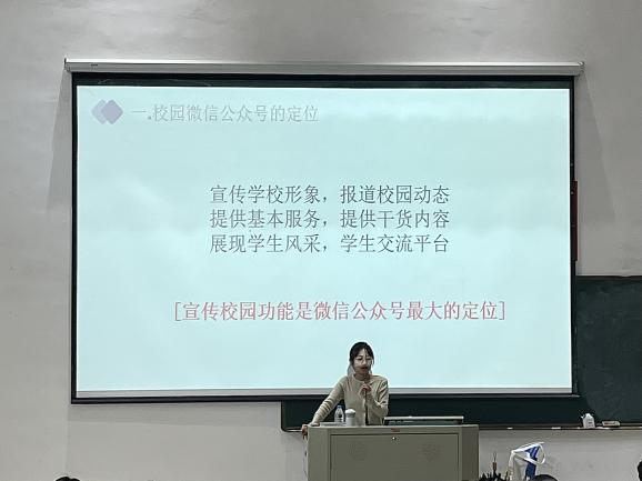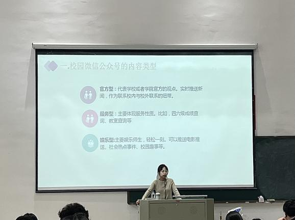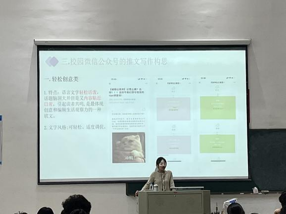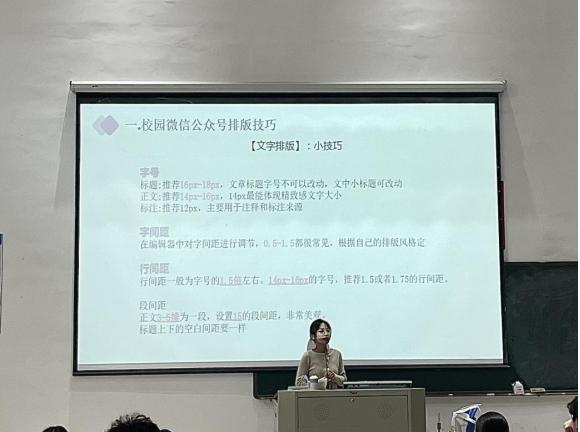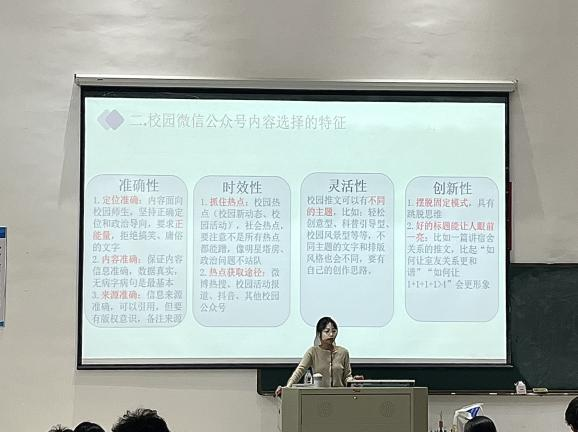 随后叶晓莉老师向学员们介绍校园微信公众号的类型特征,详细解读了网络新媒体工作的选题及注意事项,分享推文写作构思和排版技巧,帮助学员更加准确地把握写作内容方向、如何结合青年需求,提高受众关注度,引领青年、贴近青年生活,激发青年共鸣。