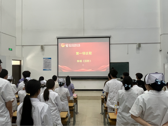 参会人员,全体起立,奏唱团歌。本次医疗护理系团总支2024年五四表彰大会在歌声中落下帷幕。