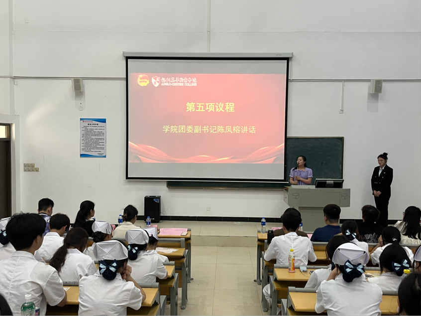学院团委副书记陈凤榕发表讲话,她代表学院团委向医疗护理系的广大青年师生致以节日的问候,向受表彰的先进集体和个人表示祝贺,充分肯定了医疗护理团总支、共青团干部以及广大团员青年在过去一年中取得的工作成绩。同时对广大团员青年提出了三点希望:一是坚定理想信念,做志存高远的青年;二是厚植家国情怀,做不负韶华的青年;三是弘扬奋斗精神,做奋发向上的青年。