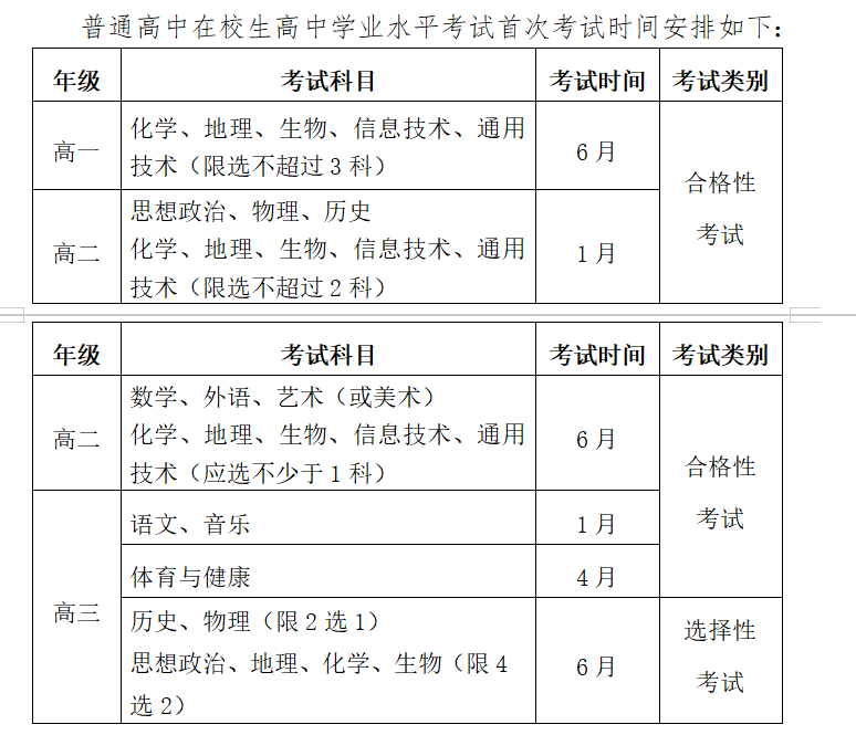 高中各科目学业水平考试相应安排在高中三个学年进行,学生在完成必修学分课程的基础上按考试时间安排参加合格性考试,思想政治、历史、地理、物理、化学、生物6门选择性考试安排在高三年级6月份全国统一高考后进行。