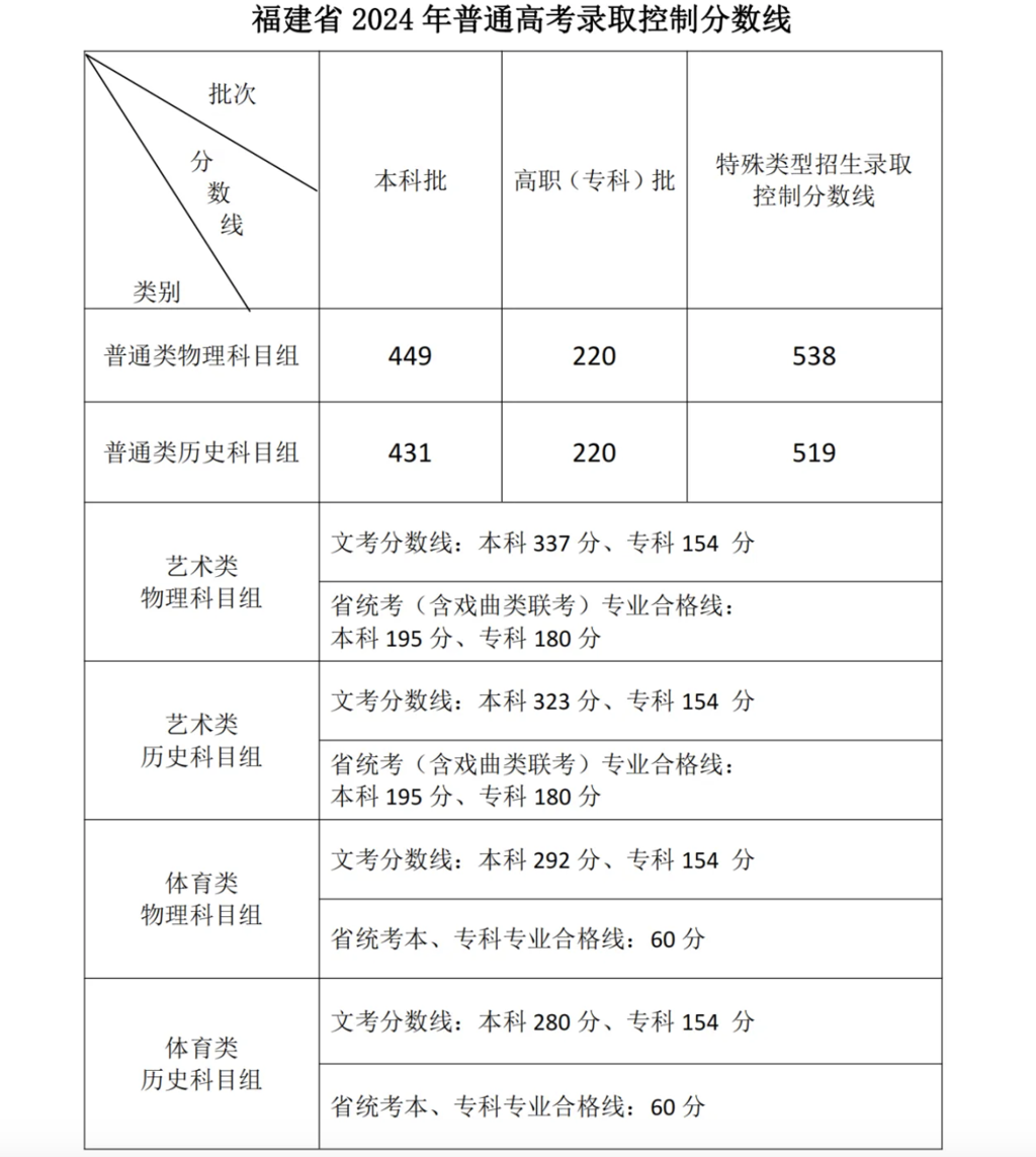 6月24日下午,福建省高等学校招生委员会召开全体会议,研究确定我省2024年普通高考切线方案,部署高招录取工作。经会议研究决定,福建省2024年普通高考各类录取控制分数线具体如下: