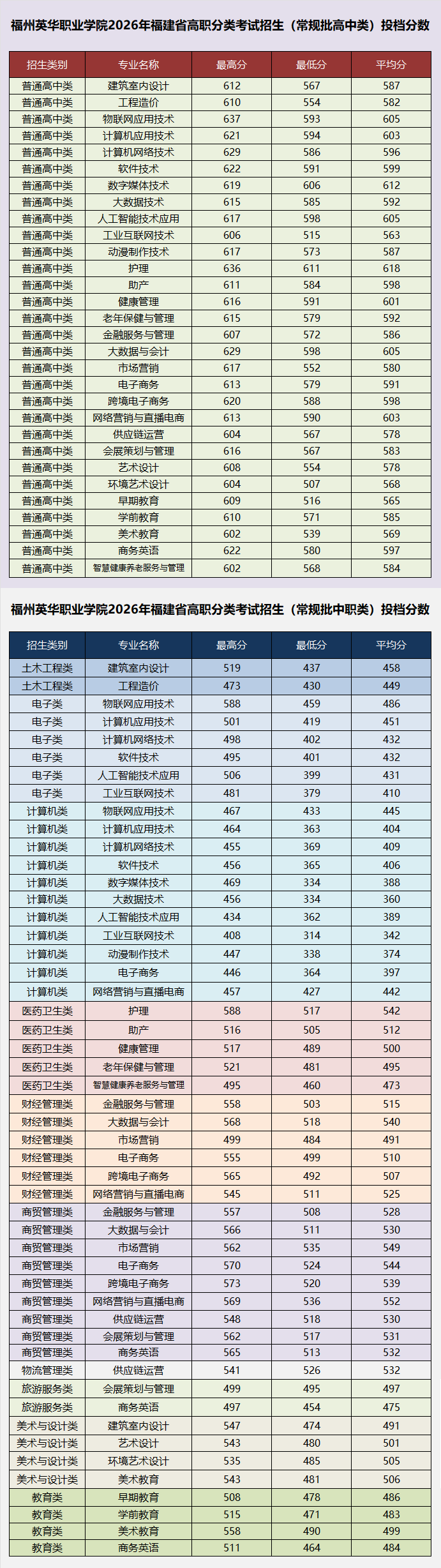 福州英华职业学院2026年高职分类考试招生各类专业录取分数表