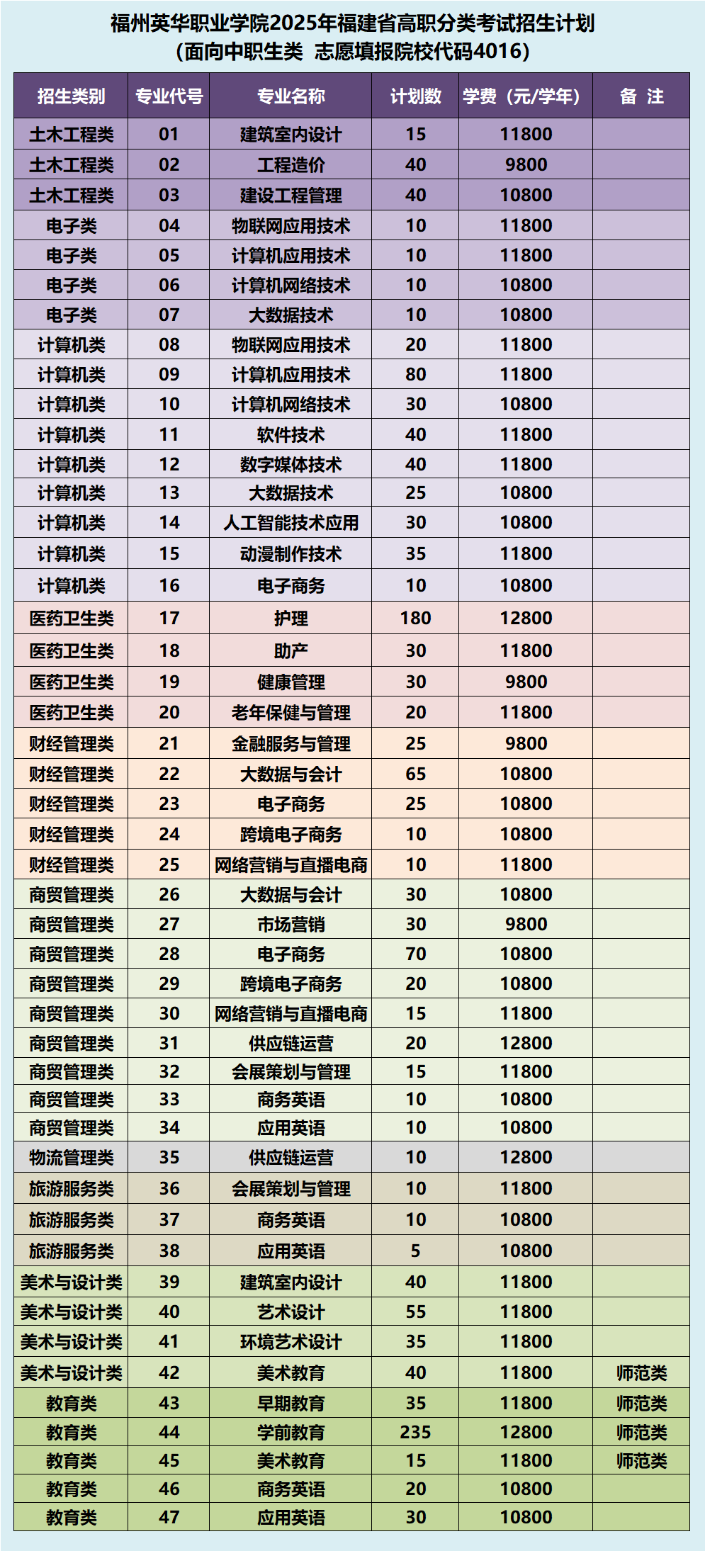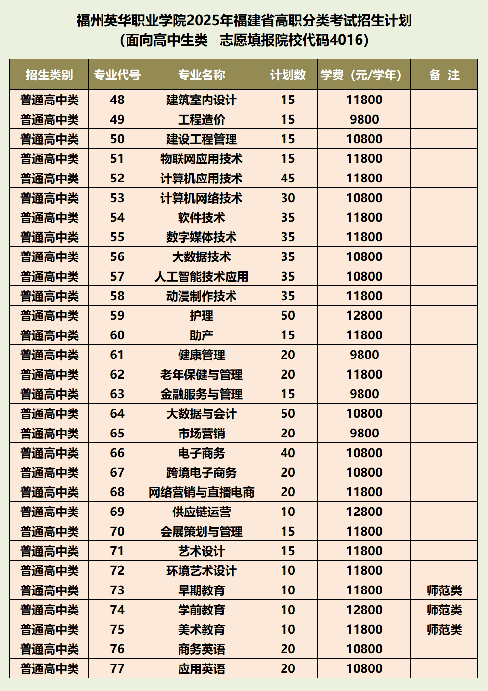 福州英华职业学院2025年福建省高职分类考试招生计划