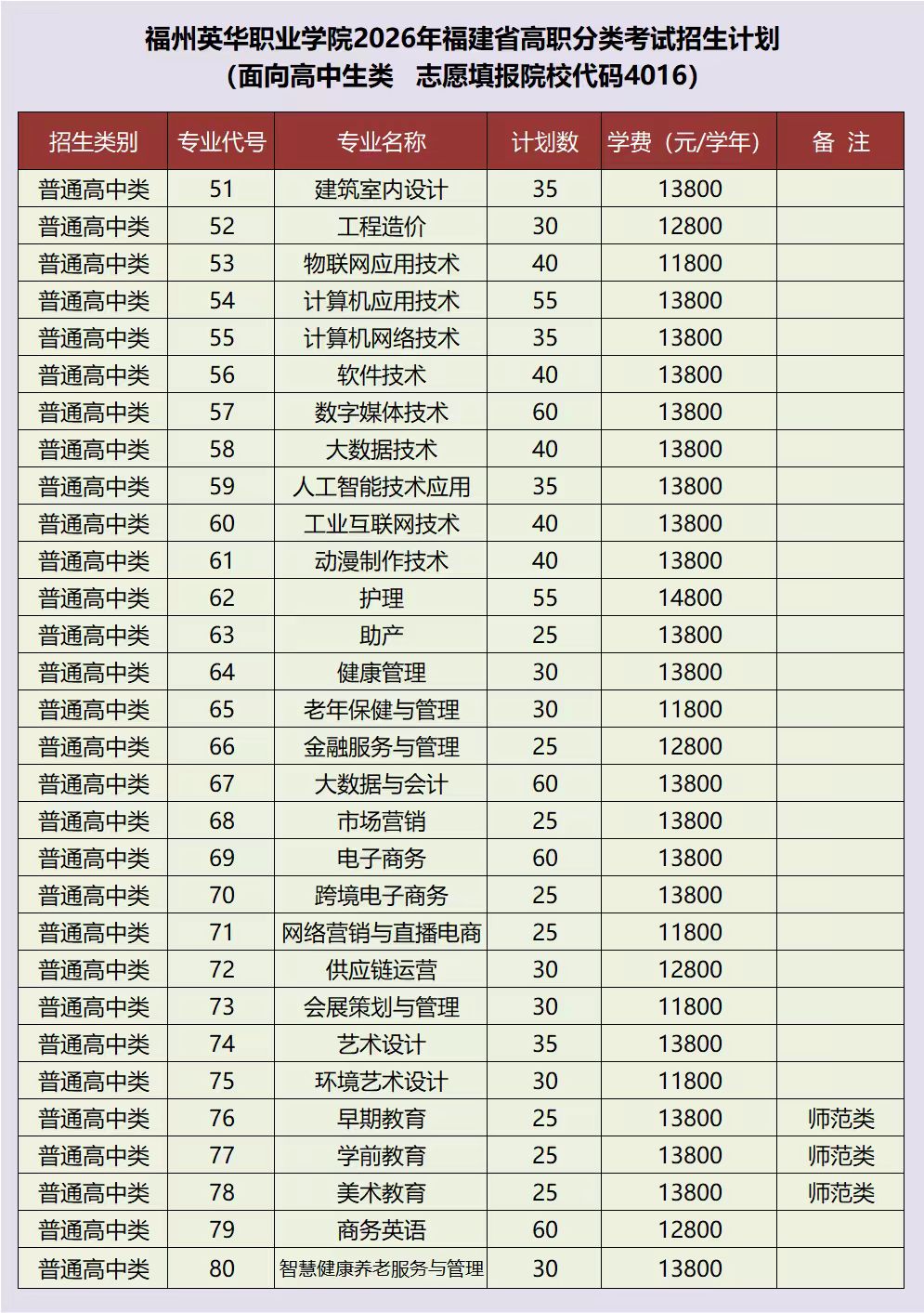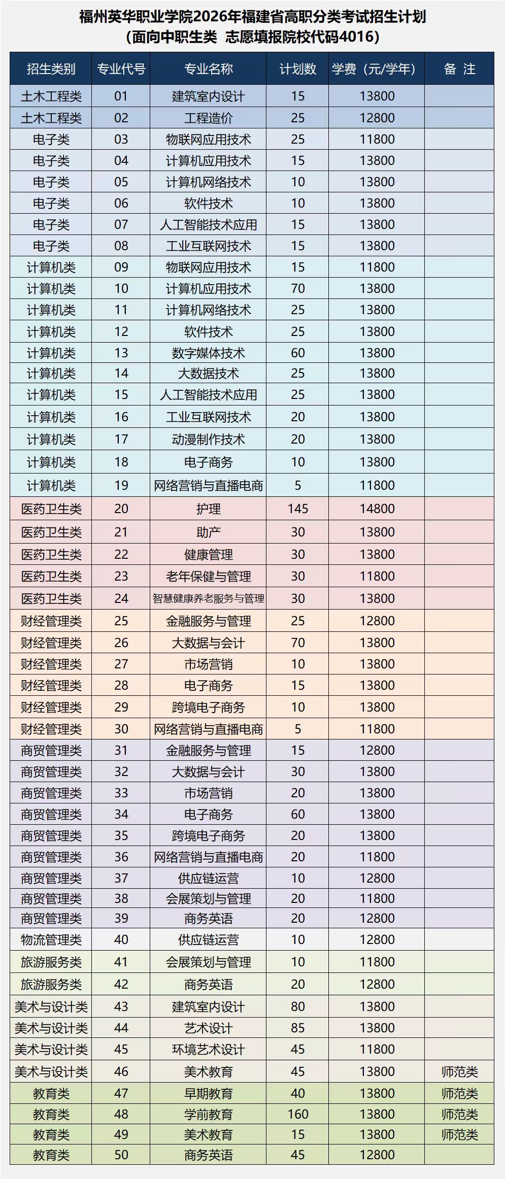 福州英华职业学院2026年福建省高职分类考试招生计划