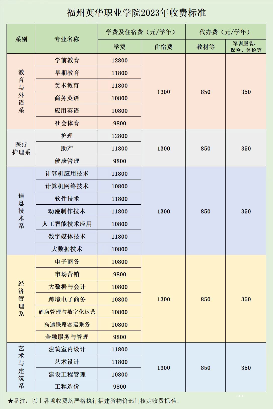 根据福州英华职业学院院务会【2023】10号会议纪要,经研究同意,现就2023年各专业收费项目及收费标准予以公示:
