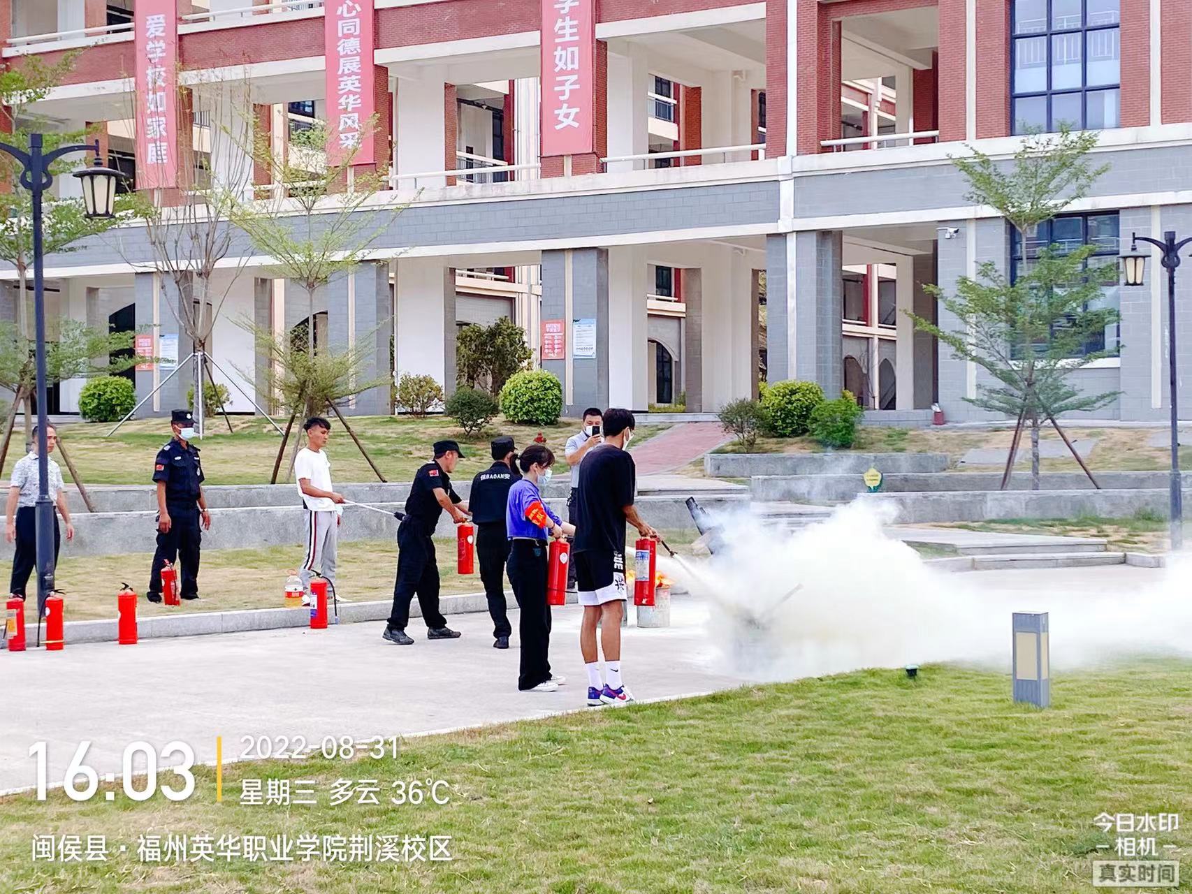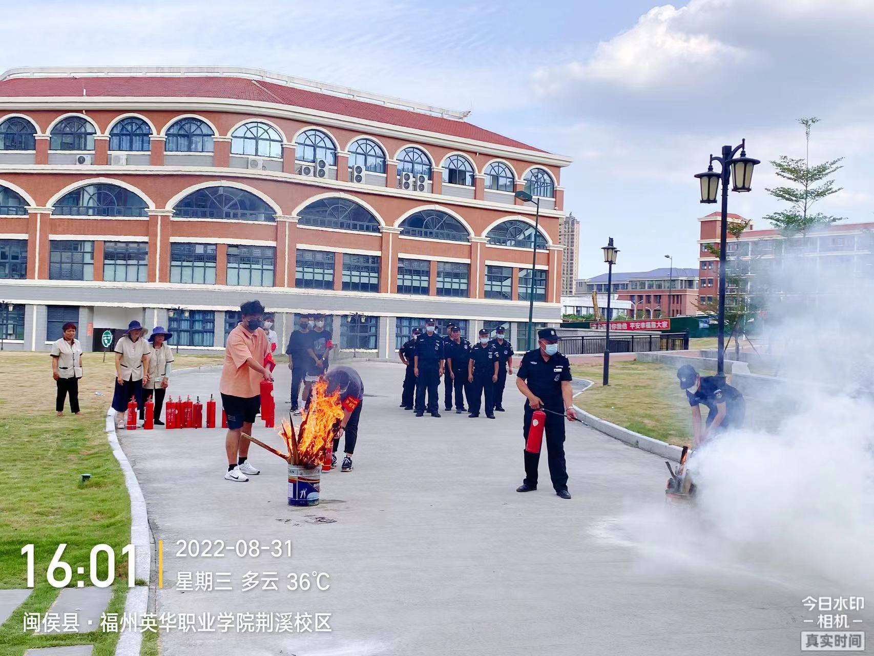 开学初为了落实教育系统相关安全文件,加强学院师生的消防安全意识及防御火灾事故能力,8月31日下午,学院保卫处组织护校队全体成员、保安人员、楼管、宿管在校园的安全地带和学院大门,进行了消防知识讲解、灭火器使用演练、校园防暴演练。