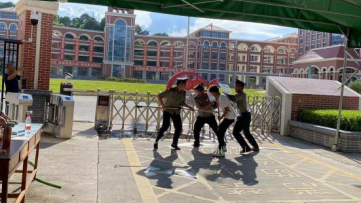 为了有效预防,及时控制和防止重大不良事件的发生,保证全校师生的生命安全,在学院东门按照突发事故应急预案进行反恐演练,以确保校园暑期和开学季门岗安全及校园师生安全。