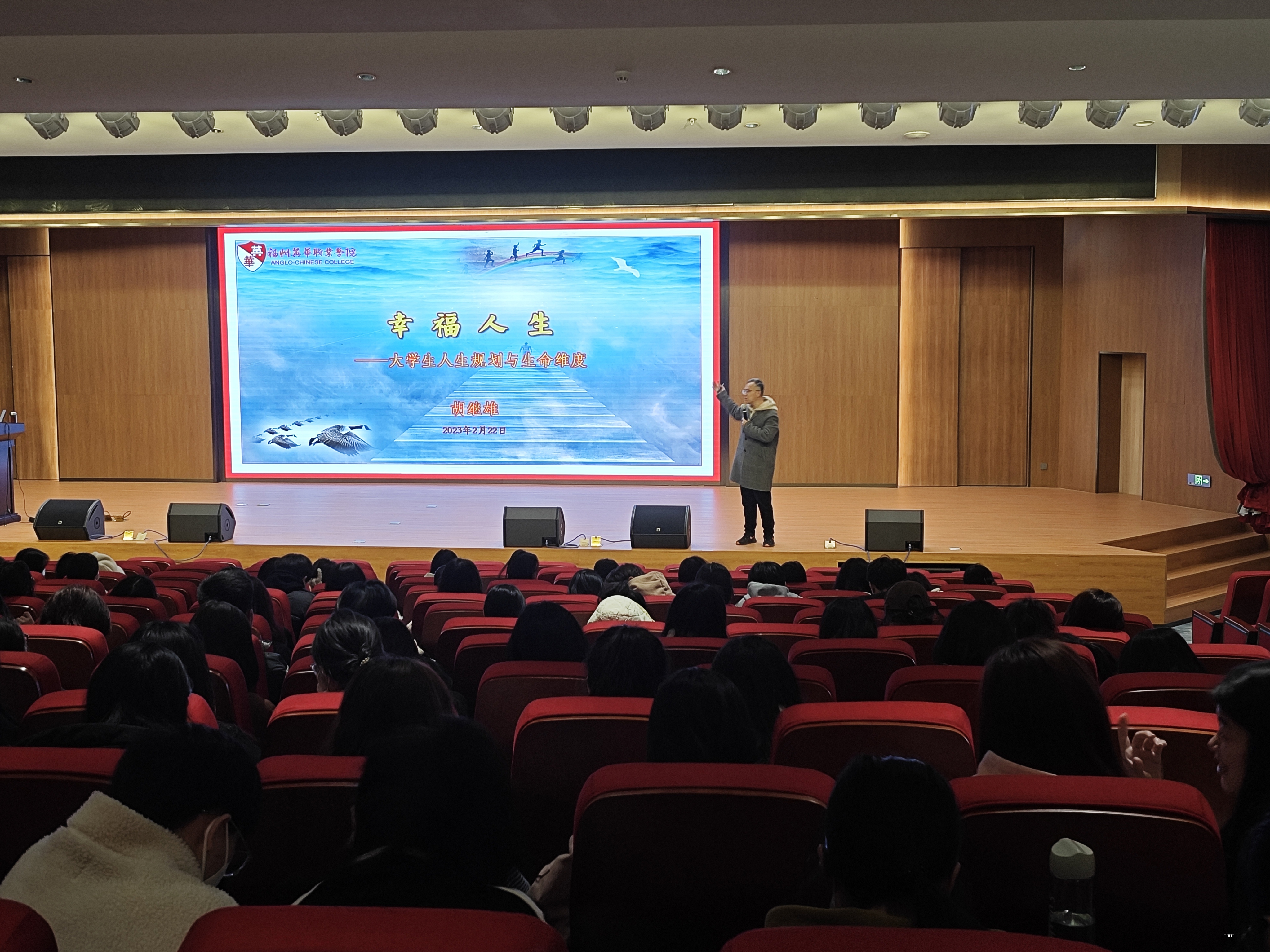 讲座中,胡继雄老师以《大学生幸福人生规划与生命维度》为题,从人生规划、财富与健康、家族与社会、人生意义、人生境界、人生德行六个方面,为同学们的人生规划上了一堂非常生动又富有哲理的课程。