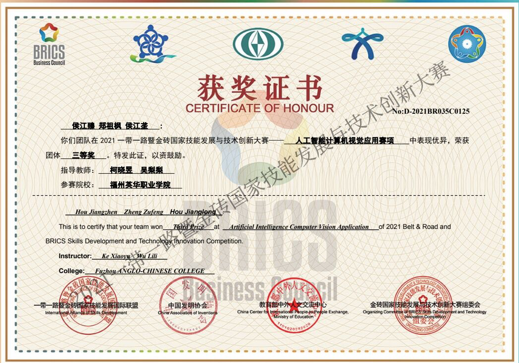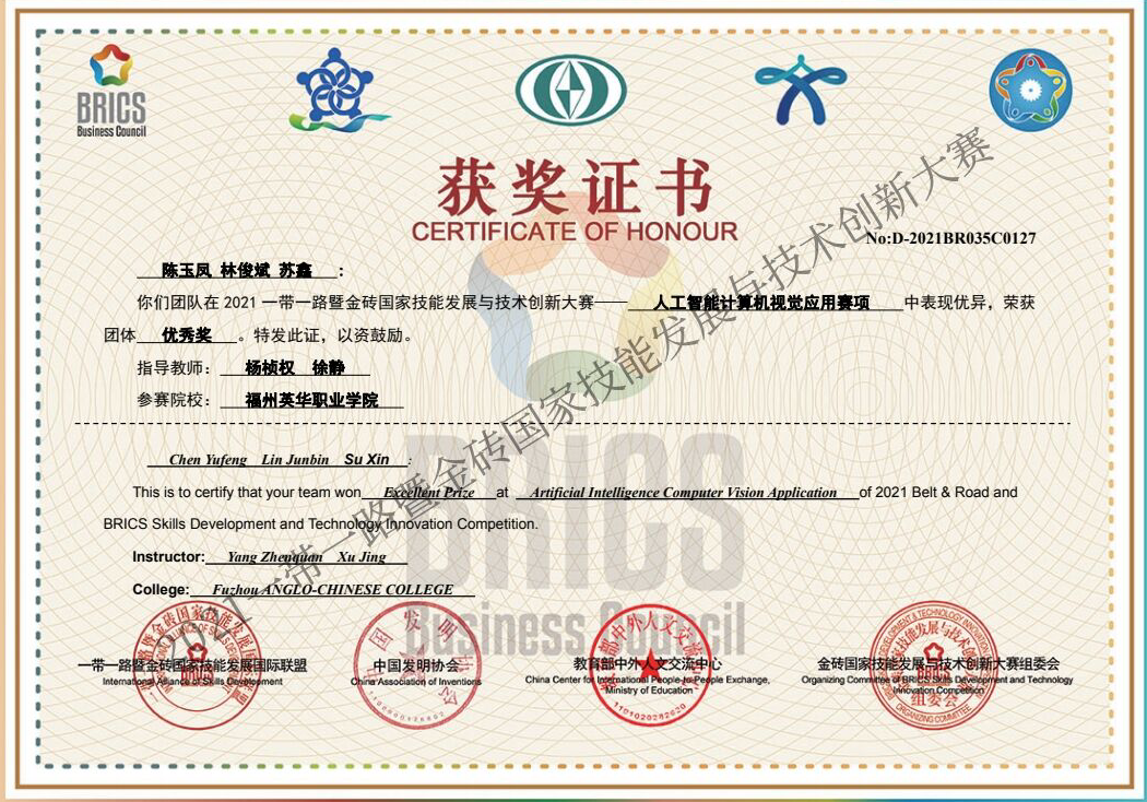 我系在首次参加的“2021一带一路暨金砖国家技能发展与技术创新大赛--人工智能计算机视觉应用赛项”中表现优异,由柯晓昱、吴梨梨指导的组别获得团体三等奖、杨桢权、徐静指导的团队获得优秀奖。