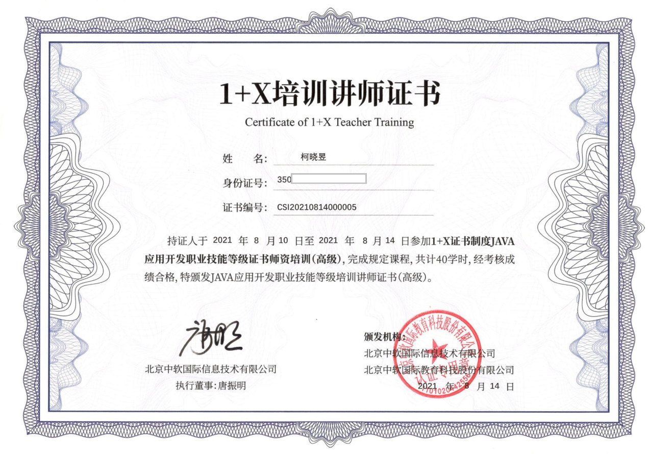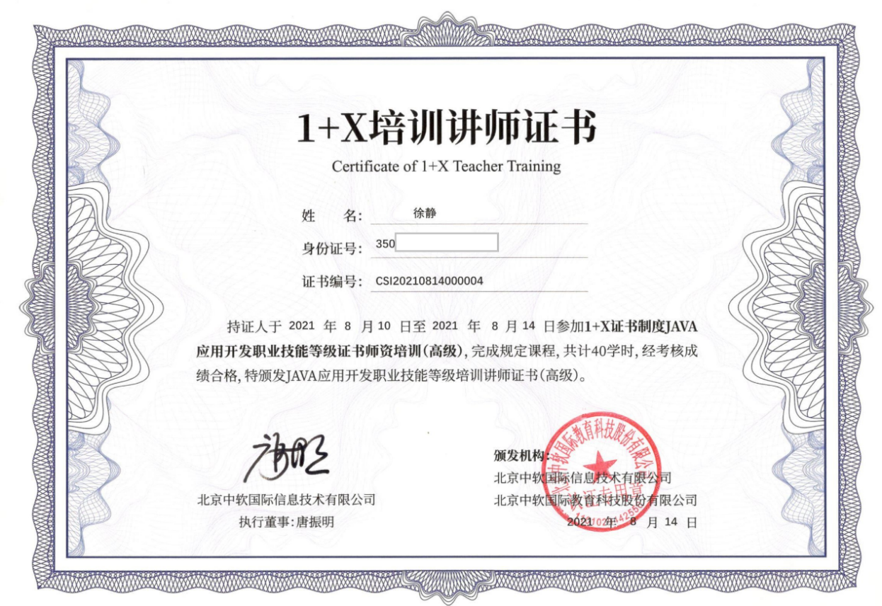 为深入贯彻《国家职业教育改革实施方案》精神,全面落实《关于组织开展1+X证书制度试点院校教师培训的通知》(教师司函〔2019〕43号)要求,提升试点院校教师团队的教学、培训、考核评价能力,建设符合1+X证书试点要求的教师团队,2021年8月10日-8月14日,我系徐静和柯晓昱老师参加了中软国际JAVA应用开发1+X证书师资培训(第九期)。为响应国家及各省市疫情防控政策要求,避免人员密集状况的出现,保障培训教师生命财产安全,本期培训采用线上培训的形式开展。