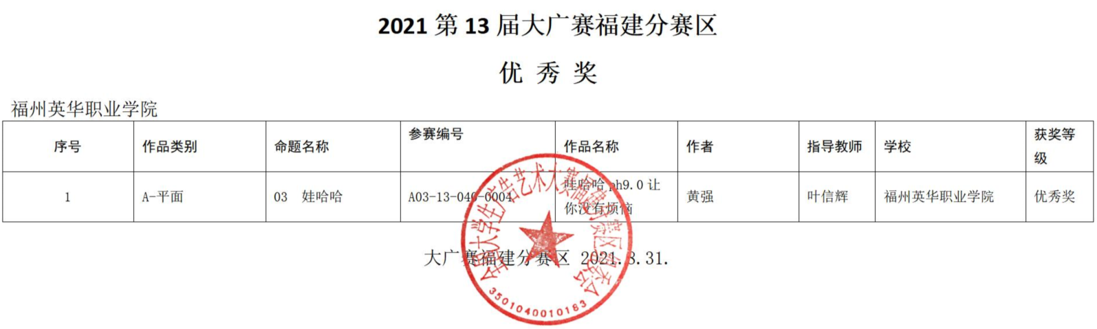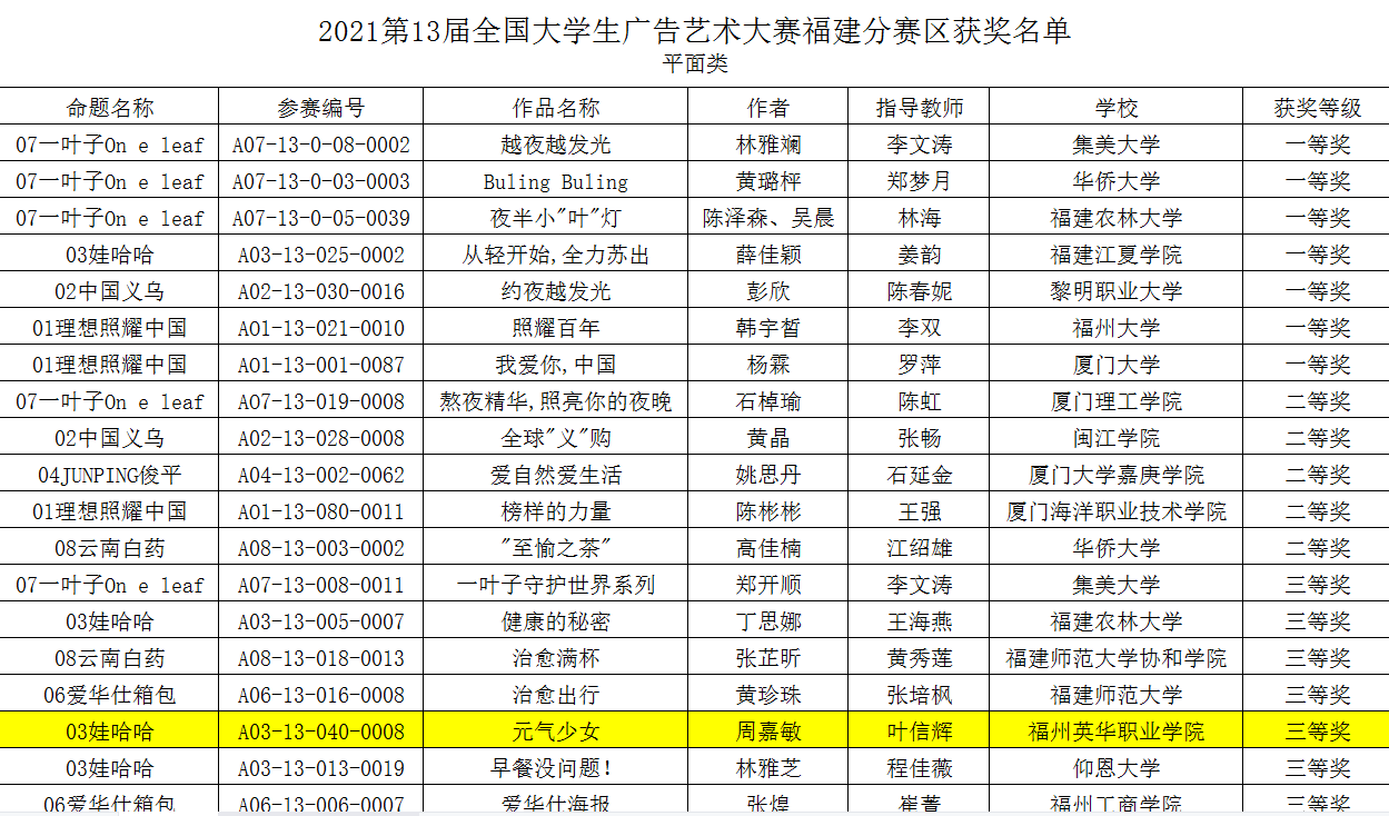 日前,由教育部高等教育司指导、福建省教育厅主办、厦门大学承办的第十三届全国大学生广告艺术大赛福建分赛区评审结果揭晓,在与厦门大学、福州大学等多所福建高校学子同台竞技中,我院信息技术系19级动漫制作技术专业学生周嘉敏斩获平面设计类比赛三等奖,数字媒体应用技术专业学生黄强获平面设计类比赛优秀奖,指导教师叶信辉。