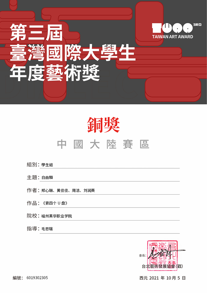 近日,第三届台湾国际大学生年度艺术奖评选结果揭晓,我系学子:郑心琳、黄佳佳、周洁、刘润英的影视作品《第四个U盘》荣获中国大陆赛区铜奖(指导老师:毛忠瑞)。