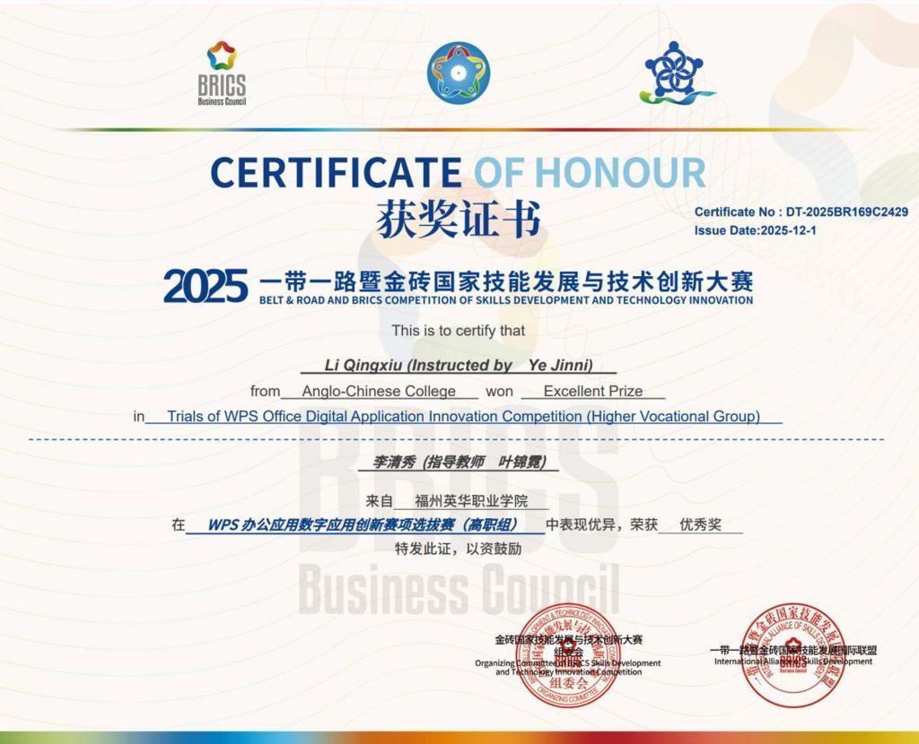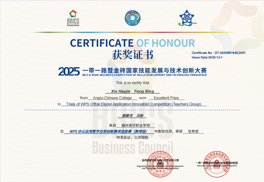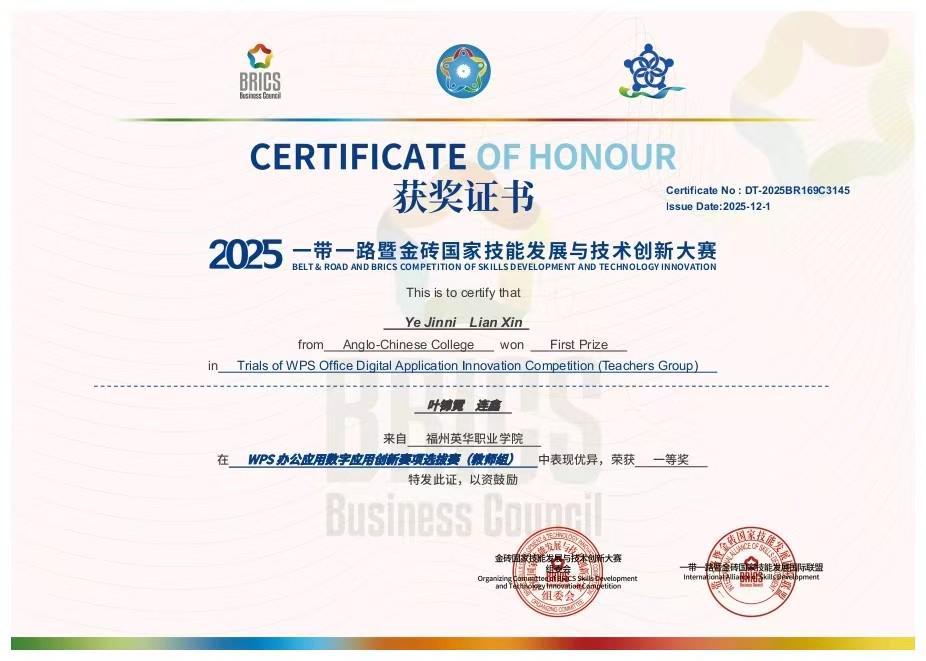 近日,2025“一带一路”暨金砖国家技能发展与技术创新大赛圆满落幕。我院信息技术系师生代表队凭借扎实的专业功底、出色的创新能力和稳定的赛场发挥,在激烈角逐中脱颖而出。在WPS办公应用数字应用创新赛项选拔赛(教师组)中获一等奖1项、优秀奖1项,在WPS办公应用数字应用创新赛项选拔赛(高职组)中获二等奖1项、三等奖3项、优秀奖1项,在第二届人工智能算法应用设计赛项(高职组)中获三等奖1项,充分展现了我院师生的专业素养与综合能力。