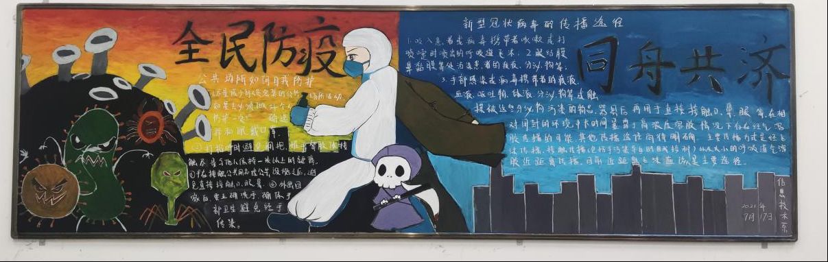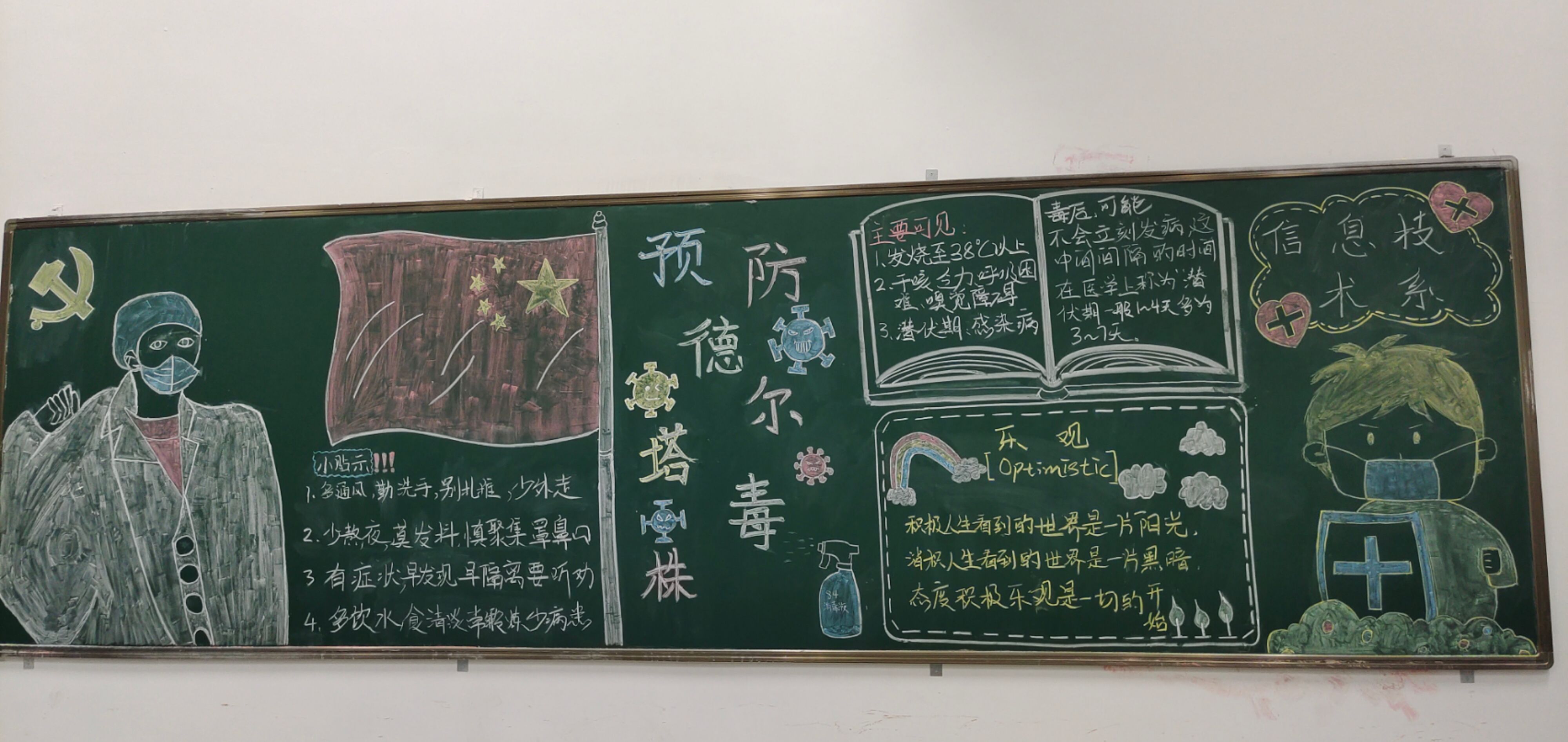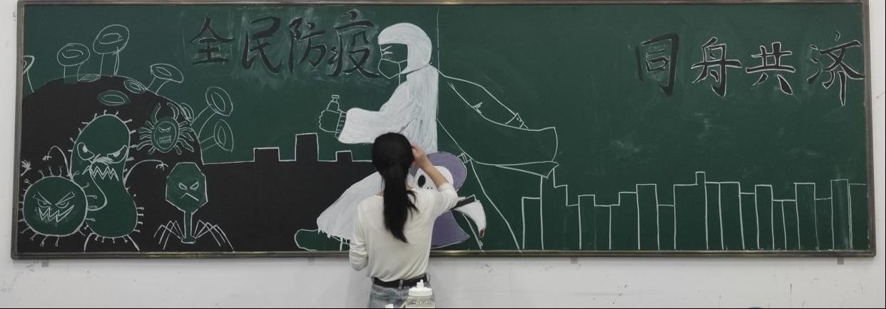 为了应对这场战“疫”,社会各界都积极防控,努力献出自己的力量,特别是战斗在一线的医护人员们,他们每天穿着厚厚的防护服,用双手给病患带来生的希望。我系学生通过画关于“抗疫”主题黑板报的方式,用形式多样的作品表达自己对一线抗“疫”的医护人员崇高敬意和感谢。