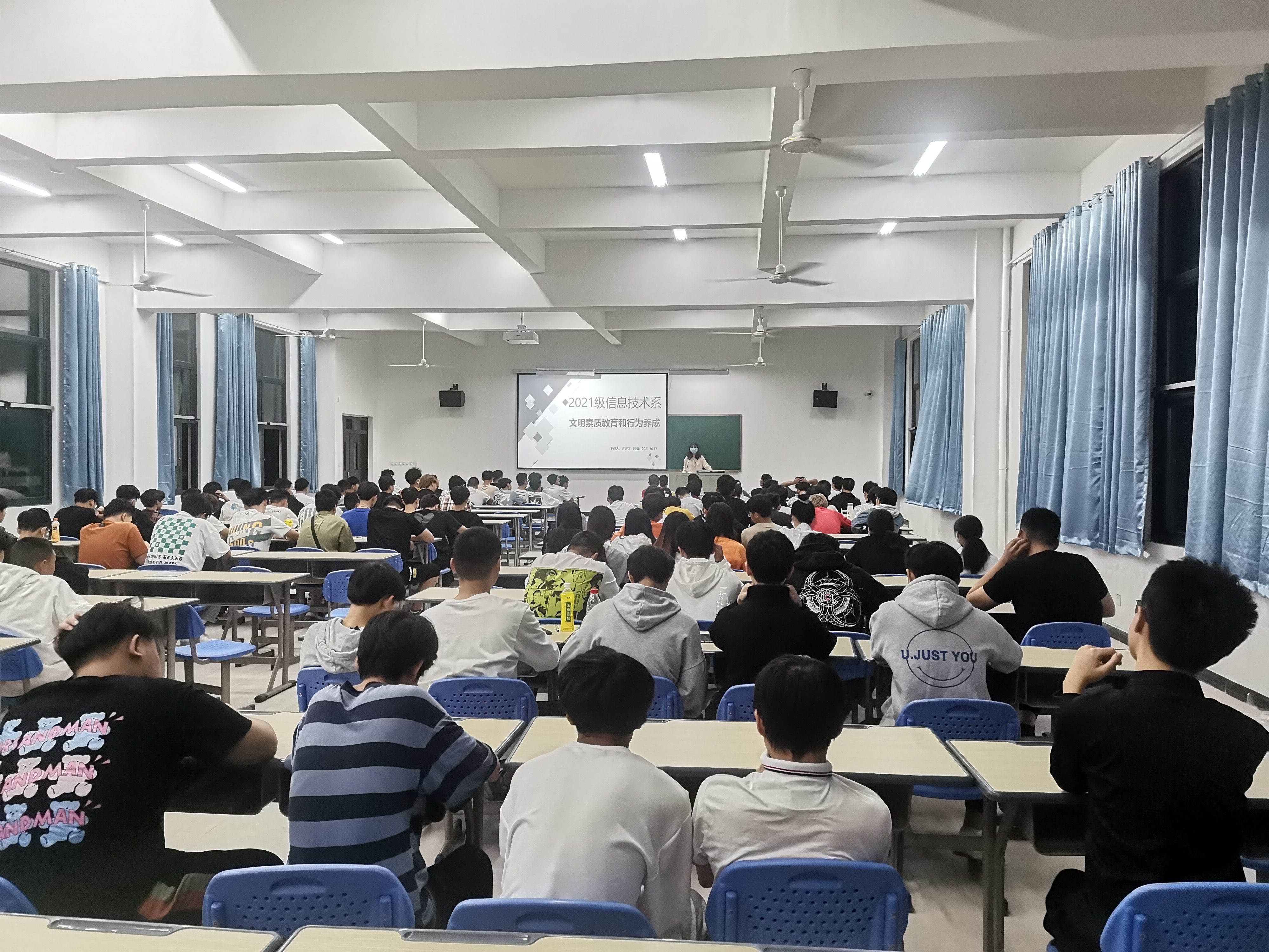 为了积极响应我院关于新生入学文明素质教育的要求,以及规范学生行为习惯。2021年10月17日信息技术系于教学楼五号楼501教室开展“崇尚文明礼仪,构建和谐校园”文明素质教育和行为养成主题班会。出席本次班会的有沈嘉煌、林娜、刘杰、官诗琪以及全体信息技术系2021级新生同学。