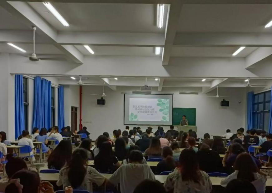 首先,辅导员向我们普及了夏季易发生的疾病、症状及其注意事项。向我们讲述疾病病毒的传播,促进同学们养成良好的生活习惯,勤洗手,讲卫生,做好宿舍卫生,阻止疾病的传播,切断传播途径,保证充足的睡眠,合理饮食,做适当的运动,必要的避暑措施。夏季出门要做好防护工作,准备充足的水,感觉有中暑症状出现,要及时在阴凉通风环境休息,可服用藿香正气水等中药。