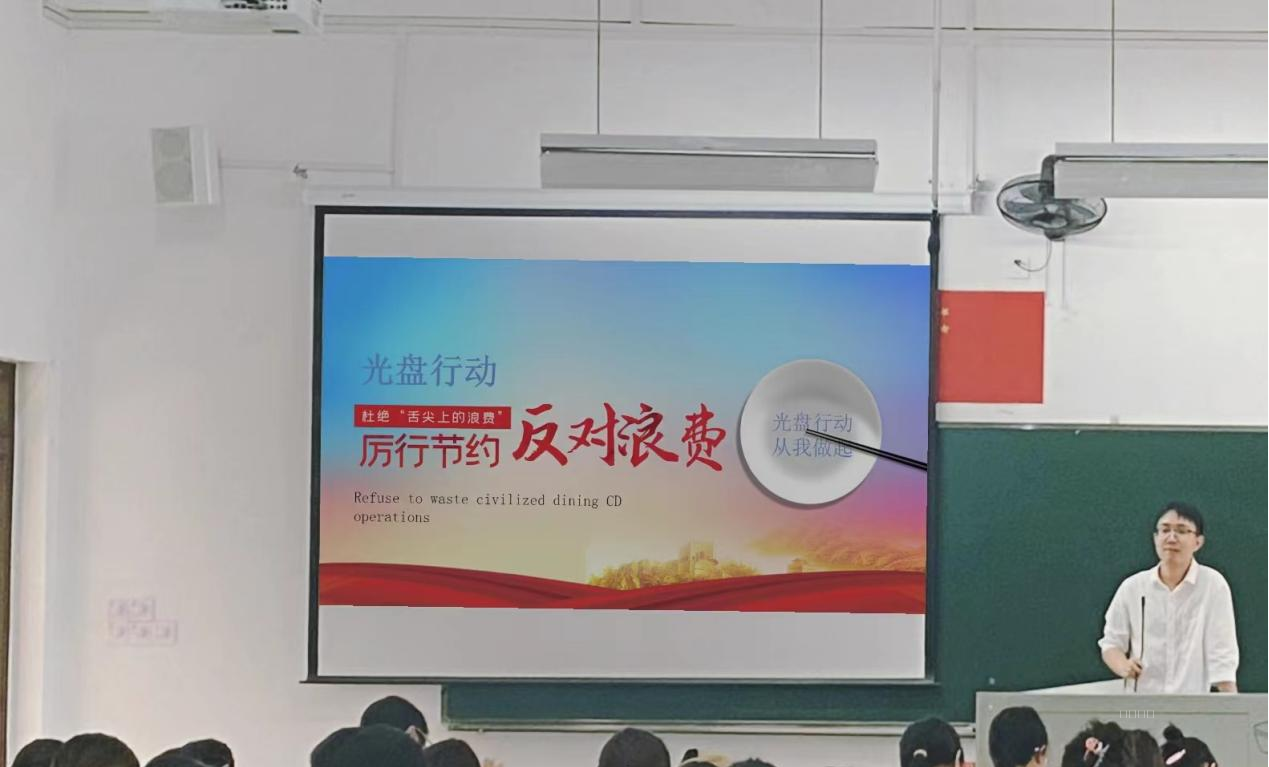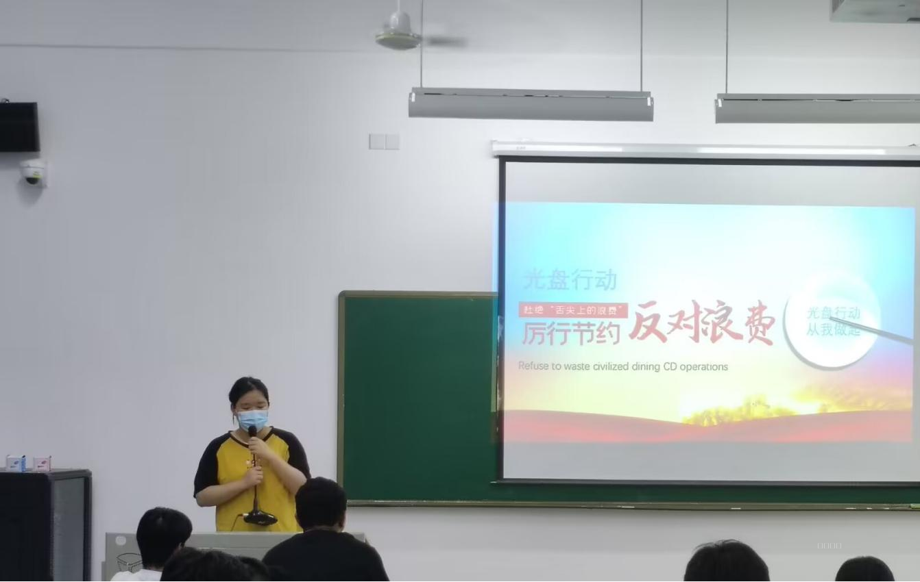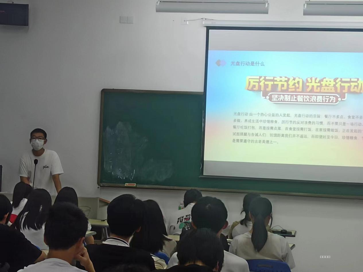 会上,辅导员们先是通过数据分析向我们介绍了现如今食品浪费的严重性。据测算,我国餐饮业人均食物浪费量约为每人每餐93克,浪费率为11.7%,大型聚会浪费率达38%。每年被倒掉的食物,足以供应两亿人一年的口粮。我国人口多、基数大,每人浪费一点,就会是惊人的量。浪费不仅给我国粮食生产带来较大压力,由此产生的大量厨余垃圾,还会导致环境污染。制止餐饮浪费,对守护粮食安全、保护生态环境意义重大。同时,也向同学们分享了一些减少粮食浪费的方法。