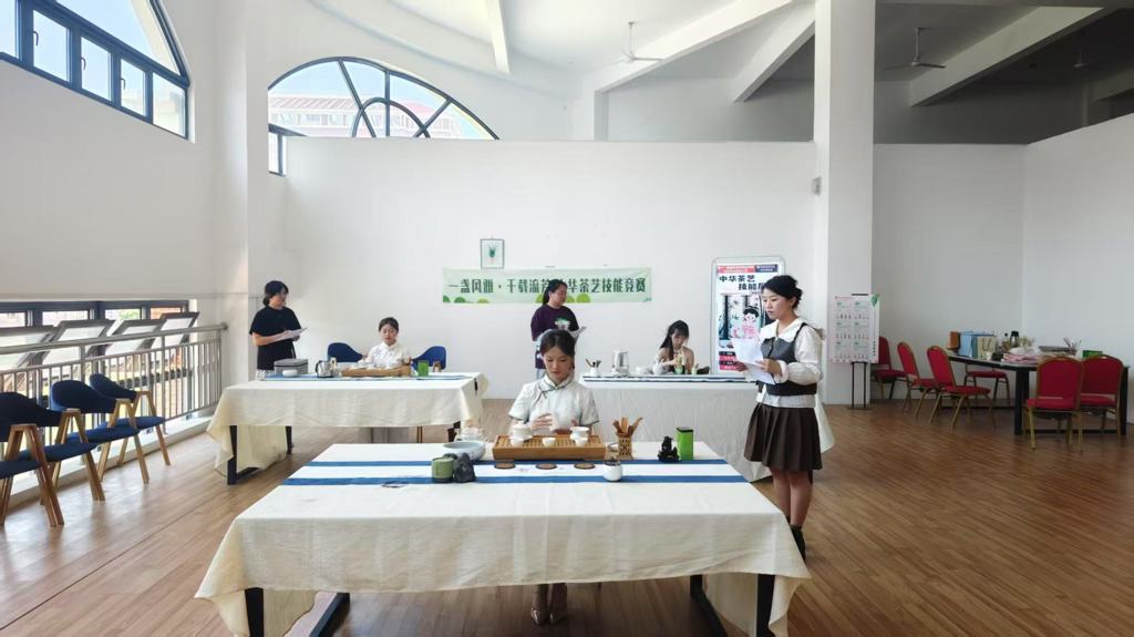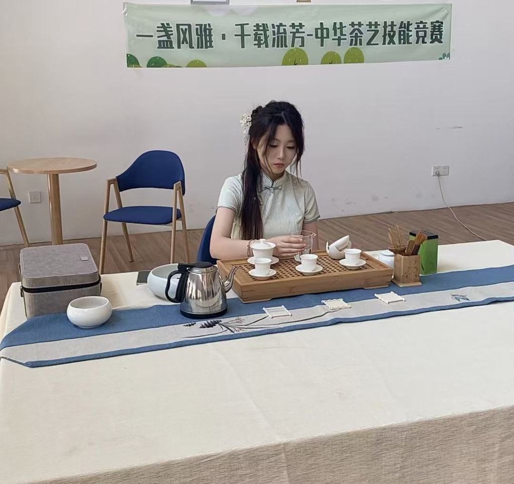 近日,我院经济管理系第十一届大学生职业技能竞赛——中华茶艺技能展示决赛在霖顺实训楼二楼208室圆满落幕。本次茶艺决赛吸引了酒店班众多优秀学生参与。比赛现场茶香四溢,选手们身着中国传统服饰,姿态优雅,动作娴熟地进行着每一道茶艺工序,尽显专业风采。