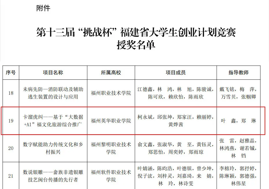 根据《关于组织开展第十三届“挑战杯”福建省大学生创业计划竞赛的通知》,6月10日由团省委、省教育厅、省人社厅、省科协、省学联联合举办的第十三届“挑战杯”福建省大学生创业计划竞赛落下帷幕。经大赛组委会资格审查,网络初评,大赛评审委员会复评,终审决赛评审等环节,我院经济管理系叶鑫、郑琳老师指导的项目《卡溜虎纠——基于“大数据+AI”福文化旅游综合推广》喜获职业院校组铜奖。