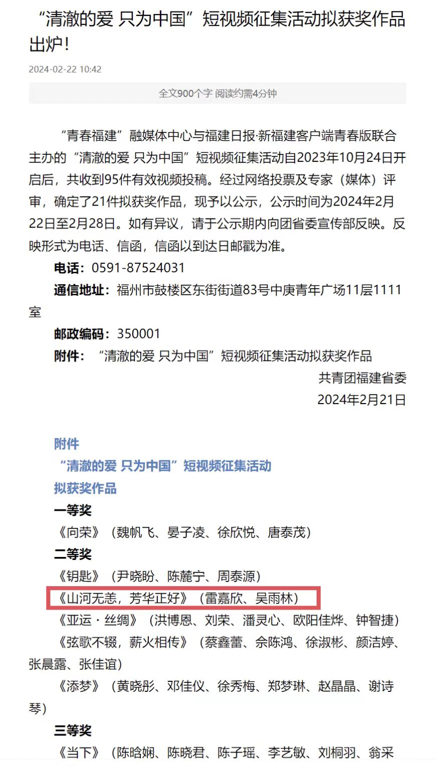 近日,“青春福建”融媒体中心与福建日报·新福建客户端青春版联合主办的“清澈的爱 只为中国”短视频征集活动顺利结束。在“清澈的爱 只为中国”短视频征集活动赛项中,由我院经济管理系22级学生雷嘉欣、吴雨林为首等人组成我院经济管理系代表队参赛,在全省各类参赛院校中脱颖而出,经过激烈比拼最终荣获二等奖。