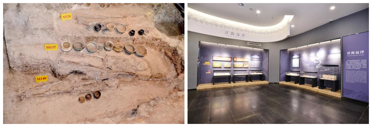 馆内陈列的贝刀、贝铲等贝器和陶釜再现了昙石山人生活场景、生活习俗、情趣爱好和宗教习俗,“贝丘”文化也展示了昙石山人捕鱼捞虾、拾取落蚌、采集牡蛎的生活习惯。展厅等考古遗迹和文物按原貌展出,让我们能身临考古现场,感受先民们用简陋的工具与自然抗衡,在步履蹒跚中将文明火种传承给后代的力量和决心。