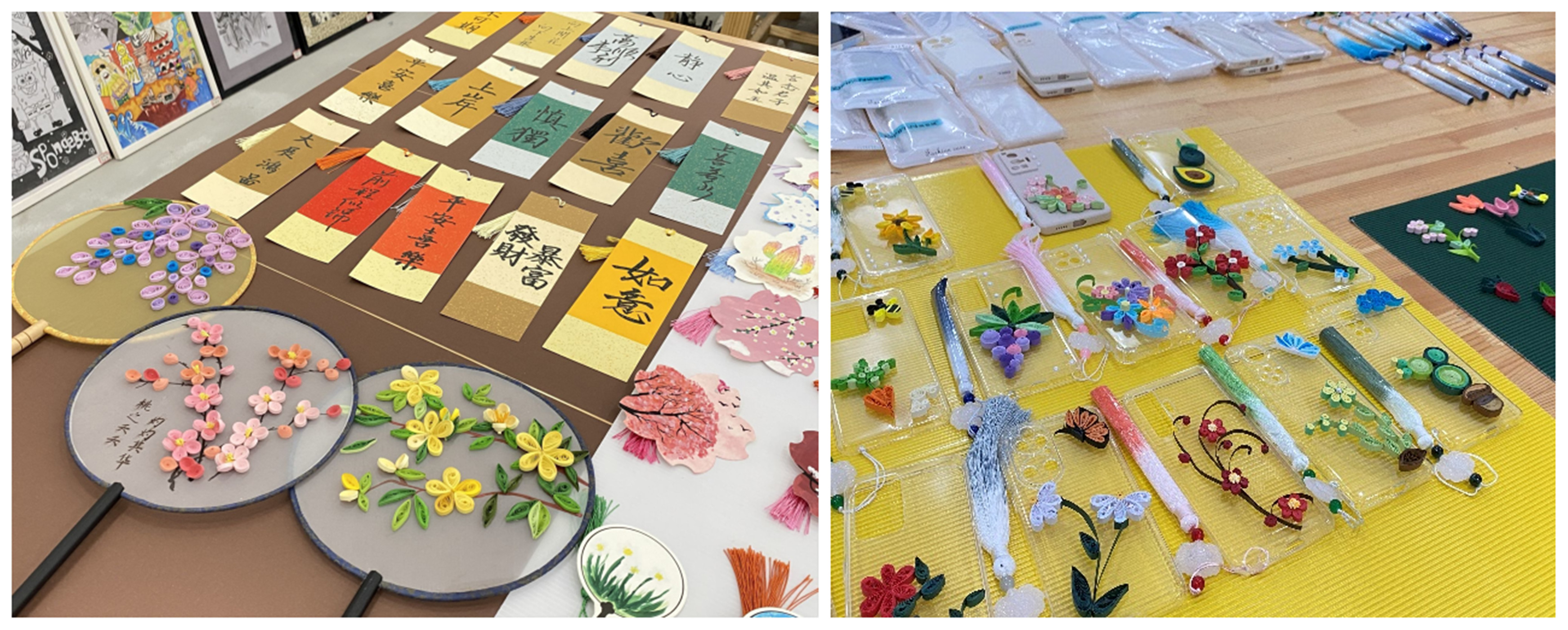 一件件学生们精心制作的创意作品在现场展示,如衍纸手机壳、缠花胸针、书签、钥匙扣、毛毡小饰品、衍纸摆件、不织布发夹等多种多样的手工艺术作品,在教室构成了一道道亮丽的风景。无不向领导老师们传递着学校职业教育的最新成果。学生们精心制作的手工艺品引得众多领导老师及同学们的驻足。领导和师生们的互动交流,对学生所展现的专业技能和创业创新能力给予了高度评价,现场的范围热情高涨。
