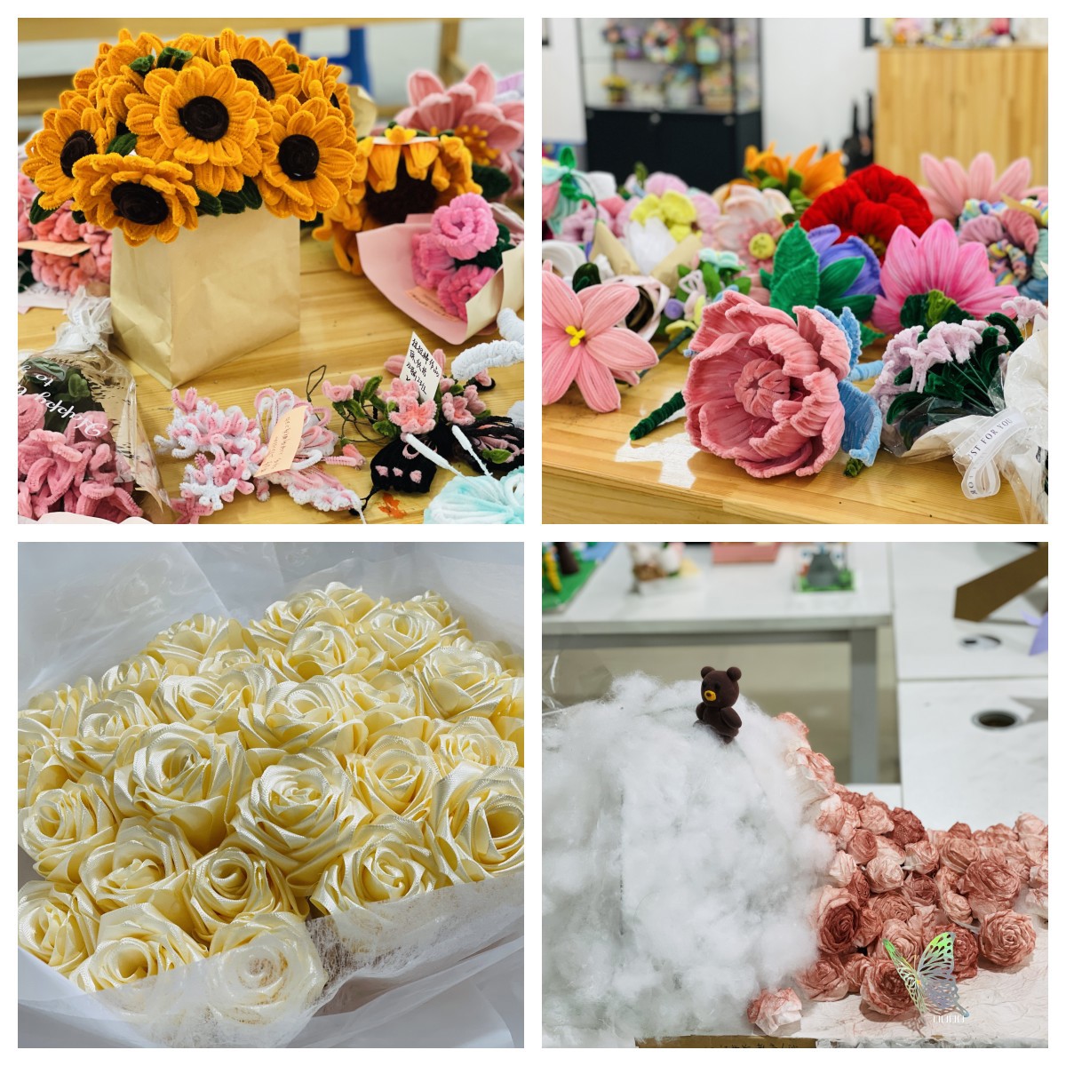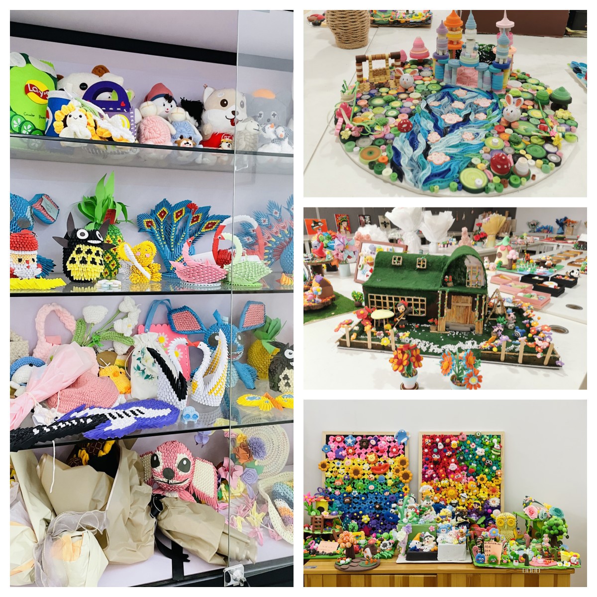 经过老师和学生们的共同努力,一件件精心制作的创意作品在现场展示,如衍纸、折纸、纸花、缠花、扭扭棒、粘土等多种多样的手工艺术作品,在教室构成了一道道亮丽的风景。