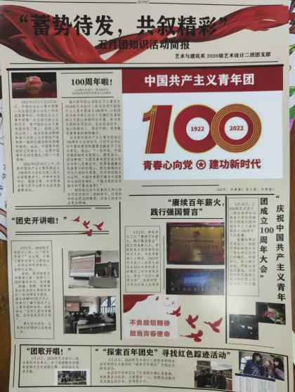 为使同学们更加直观形象地了解和学习中国共青团的历史以及体会共青团人身上所散发出的精神和品质,并把这种精神发扬和创新的同时融入到学习生活中,教育与外语系团总支在5月5日至5月27日期间组织各系各班级团支部开展“蓄势待发,共叙精彩”绘制团知识简报活动。