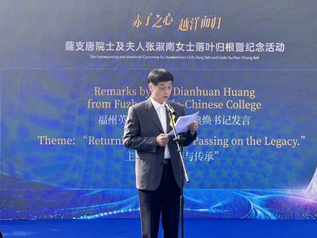 活动现场暖意融融、敬意绵长。黄典焕受邀致辞,围绕“归根与传承”主题,深情追忆了萨支唐院士与英华的深厚渊源。他指出,英华作为孕育了十六位院士的学术沃土,正是萨院士逐梦之路的起点。“尔乃世之光”的校训如明灯,照亮了萨院士追求真理、报效祖国的崇高理想。他远渡重洋,以数十年如一日的执着钻研,成为国际微电子领域的杰出学者,在世界学术殿堂树立起精神的丰碑;其落叶归根的夙愿,更是一份跨越山海的赤诚初心。