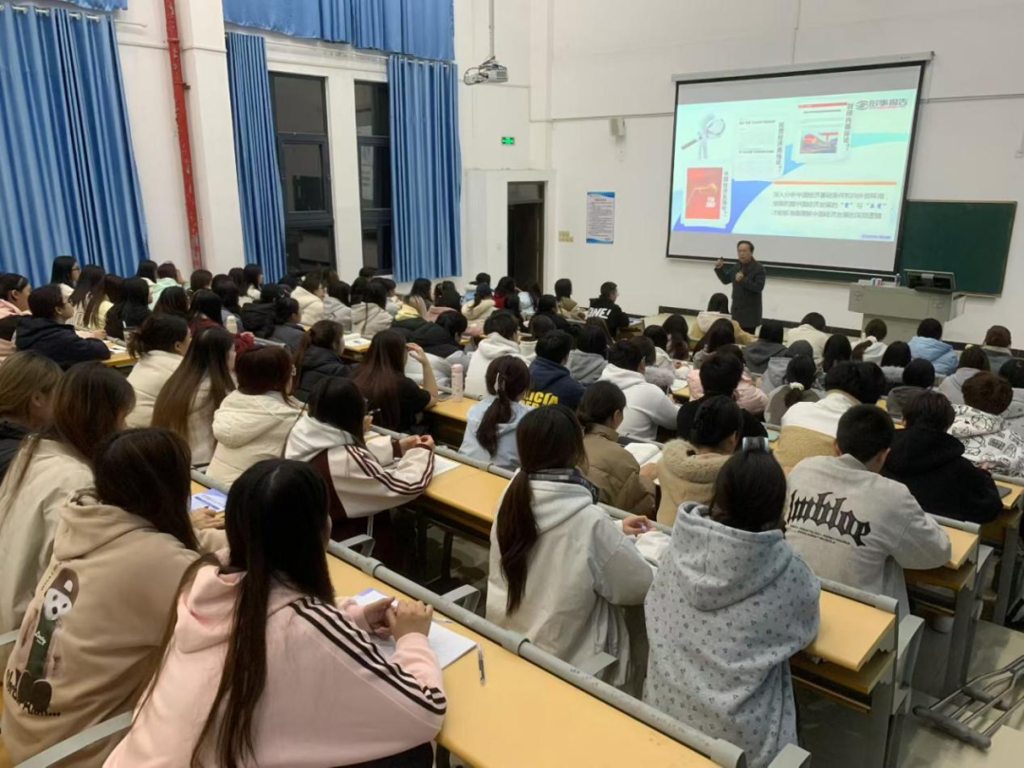 课上,陈为旭紧扣当前国内外经济发展大势,结合详实数据与鲜活案例,从中国经济发展的基本面、当前经济运行的热点难点、高质量发展背景下的机遇与挑战三个方面展开系统讲解。针对同学们普遍关心的经济热点问题,他强调,看待中国经济形势要树立全局观、辩证观。通过对比分析近年来GDP增长、就业保障、居民收入等关键数据,深刻阐明我国经济稳中向好、长期向好的基本趋势没有改变。他指出,尽管当前经济运行面临需求收缩、供给冲击、预期转弱三重压力,外部环境复杂严峻,但我国经济韧性强、潜力大、活力足的鲜明特征持续彰显,支撑高质量发展的要素条件不断积累增强。