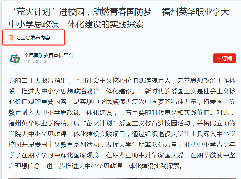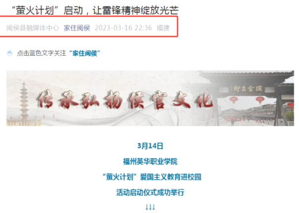 福州英华职业学院开展“萤火计划”爱国主义教育进校园活动,先后被“闽侯县融媒体”、“学习强国”等平台先后报道。