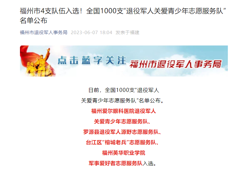福州英华职业学院军事爱好者志愿服务队在退役军人关爱青少年志愿服务项目中成功入选1000支“退役军人关爱青少年志愿服务队”。