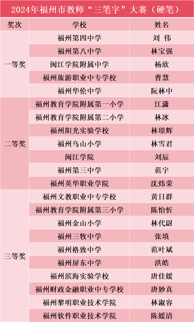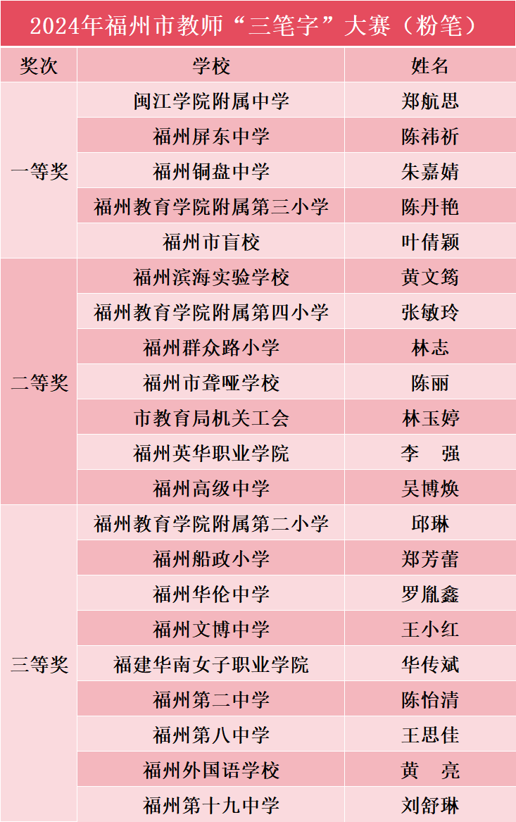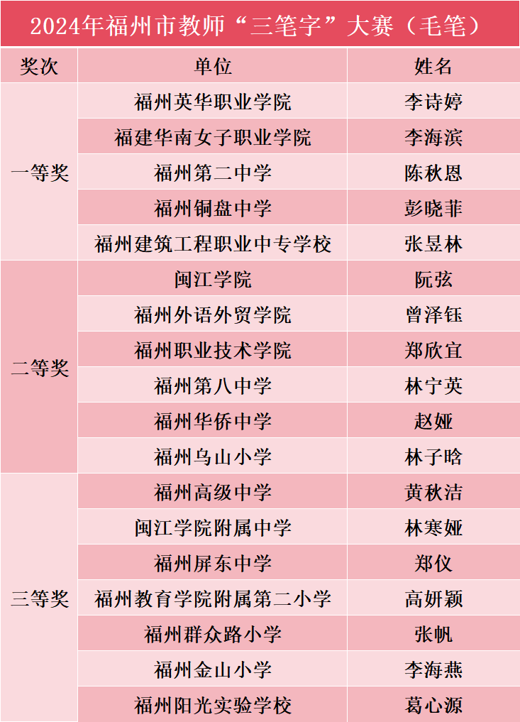 5月18日,2024年福州市直属学校教师“三笔字”基本功大赛在福州教育学院附属第二小学晋安校区举行。比赛分为硬笔组、粉笔组和毛笔组,来自市属66所大中小幼儿园教师和市教育局机关干部近184人参加。我院选送的三位老师以其过硬的基本功和出色的表现,得到现场专家评审的一致认可。其中公共基础部教师李诗婷获毛笔字一等奖,教育与外语系教师沈炜荣获硬笔字二等奖,教育与外语系教师李强获粉笔字二等奖。