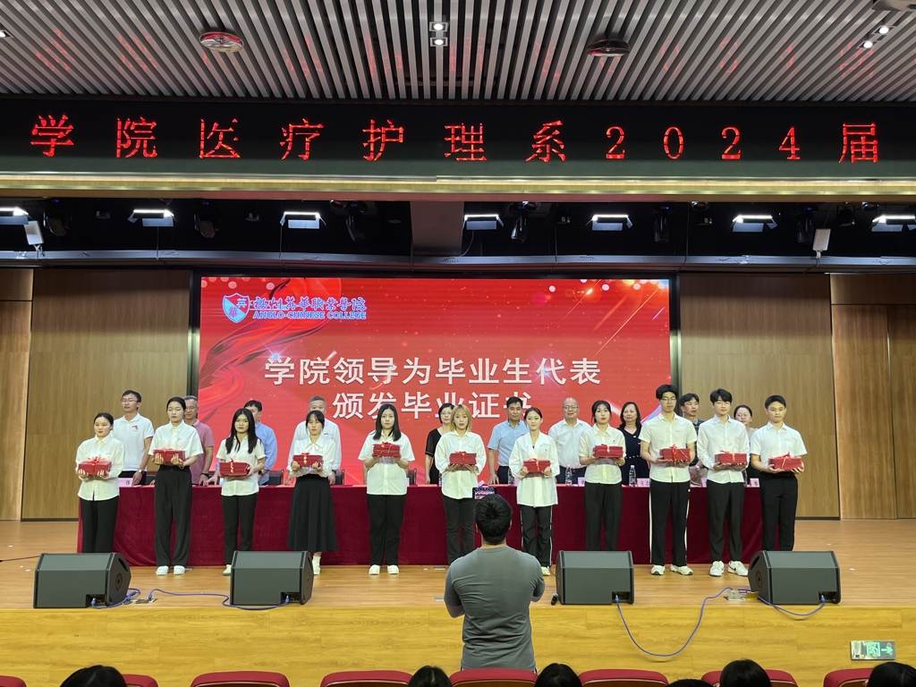 毕业典礼在庄严的国歌声中拉开序幕。第一副院长陈贞健宣读《医疗护理系2024届366名学生准予毕业的决定》;副院长黄志宁宣读《关于表彰医疗护理系优秀毕业生的决定》。毕业证书的颁发,不仅标志着毕业生们正式结束了在学院的学习生活,更象征着他们已准备好以专业知识和技能服务社会,承担起护理工作者的责任和使命。他们将带着学院的祝福和期望,踏入社会,开启新的人生旅程。