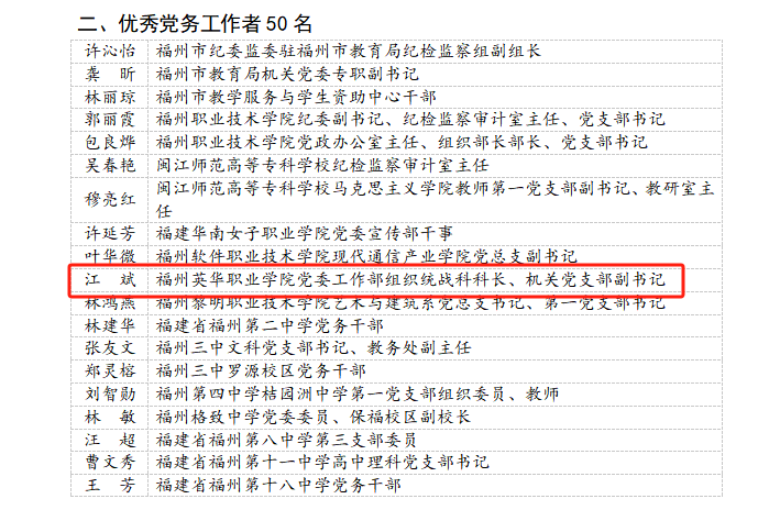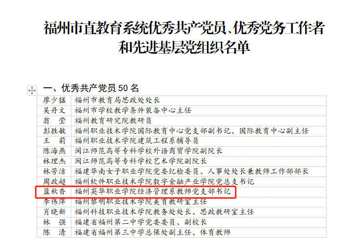 近日,中共福州市委教育工作委员会发布《关于表彰市直教育系统优秀共产党员、优秀党务工作者和先进基层党组织的决定》,其中,我院蓝秋香同志荣获“优秀共产党员”荣誉称号,江斌同志荣获“优秀党务工作者”荣誉称号。