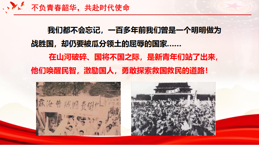 我们永远不会忘记,100多年前,我们曾作为一个明明是战胜国却仍要被瓜分领土的国家,受尽入侵者的欺辱,在山河破碎,国将不国之际,是新青年们站了出来,他们唤醒民智,凝聚民心,激励国人勇于探索救国救民的道路。