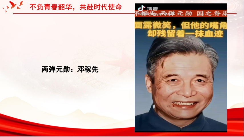 同志放心,现在的中国不打仗了,现代化的武器捍卫着国门,世界一流的军队正在建成,我们再也不是那个任人宰割的中国。现在的中国继承了第一代科学家精神,甘于奉献,勇于探索,你看天眼探空,墨子传信,北斗组网,嫦娥奔月,一个个领先世界的科技文明,从追赶到并跑,甚至是领跑,百年大党风华正茂,创新中国,朝气蓬勃。