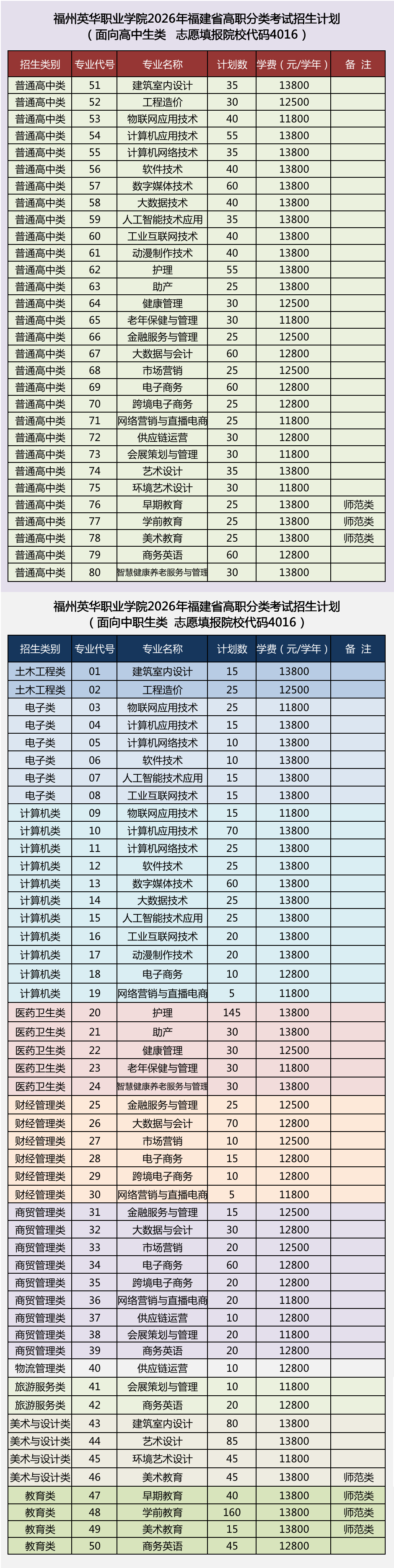 福州英华职业学院2026年福建省高职分类考试招生计划