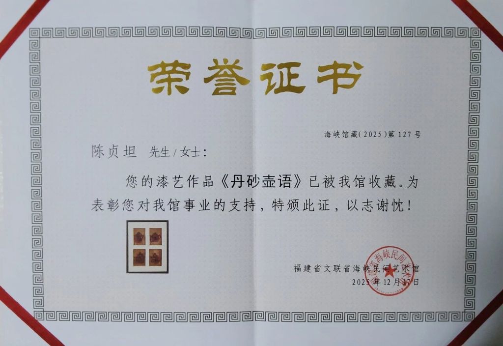 近日,我院教育与外语系教师陈贞坦创作的漆艺作品《丹砂壶语》经过严格筛选,成功被福建省文联海峡民间艺术馆收藏。