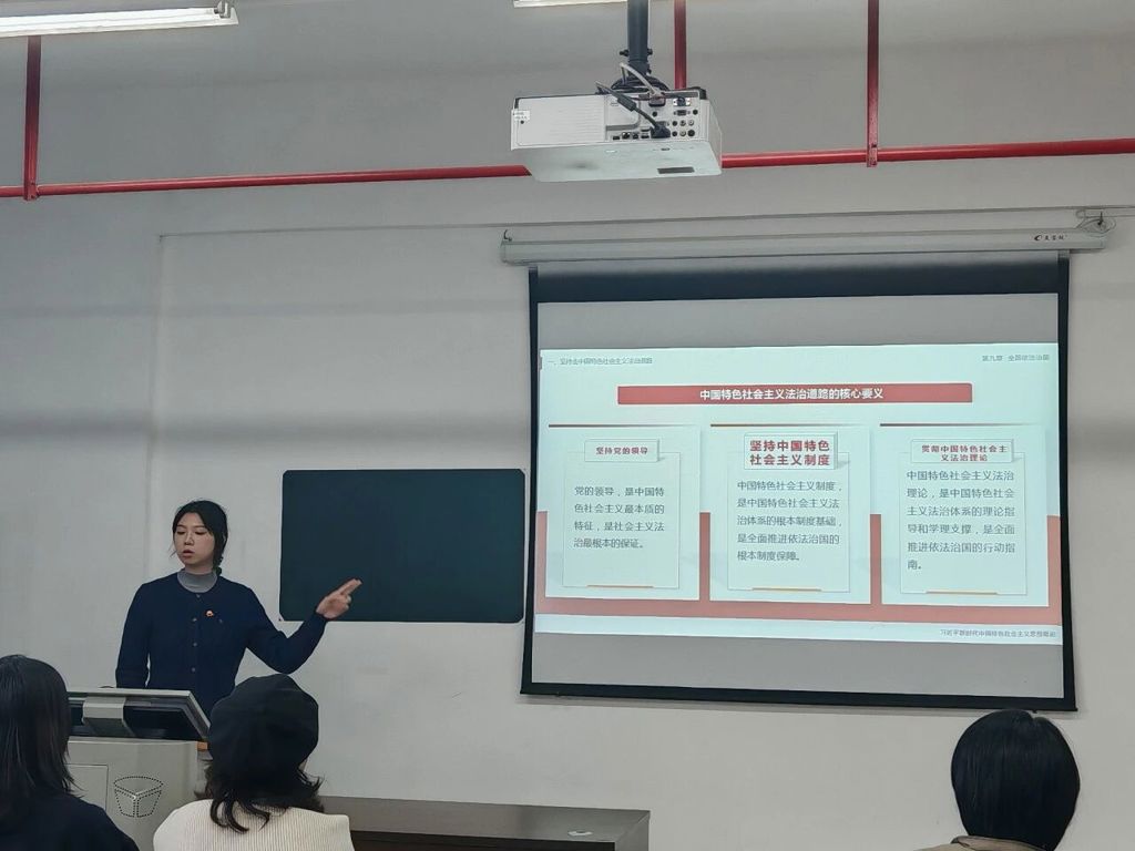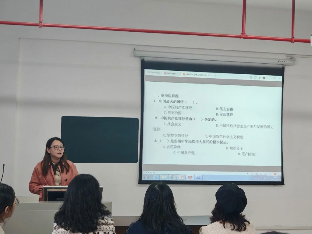 在教师教学展示环节,三位教师依次进行了精彩的教学分享。张楠柳围绕第九章“全面依法治国”,深入阐释了“全面依法治国的唯一正确道路”;江斌以第四章“坚持以人民为中心”为主题,生动讲述了“人民是历史的创造者,是真正的英雄”;赖靖靖结合第六章“推动高质量发展”,系统讲解了“贯彻新发展理念是关系我国发展全局的一场深刻变革”。三位教师的展示紧扣主题、内容充实,充分展现了马克思主义学院教师的理论功底和教学能力。